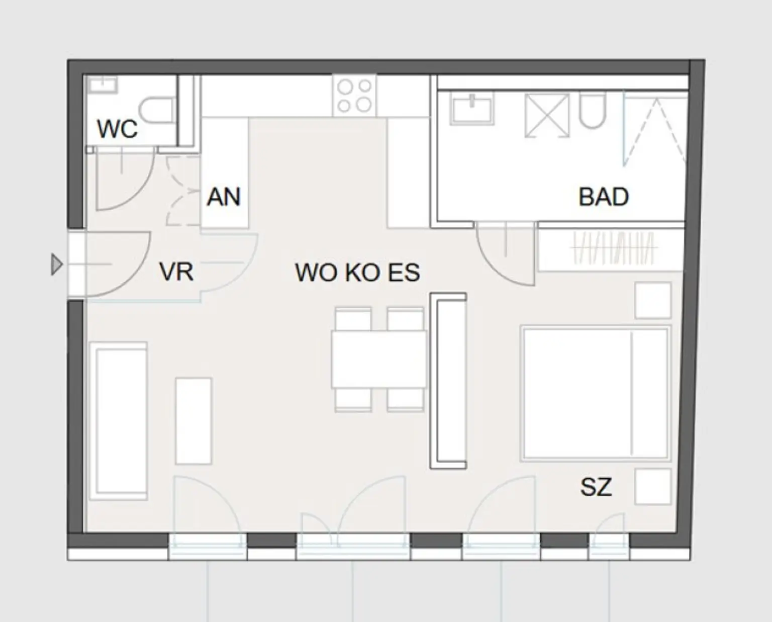 VORZIMMER, WOHN-ESSZIMMER MIT OFFENER KÜCHE, SCHLAFZIMMER, BADEZIMMER MIT WC, SEPARATES WC UND KELLERABTEIL
