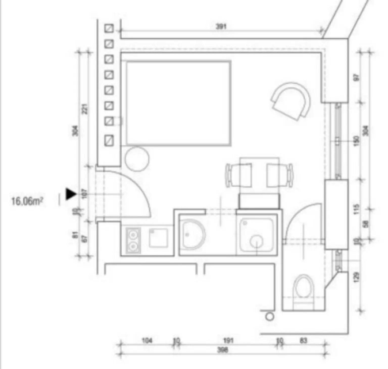 Wohn-/Schlafraum mit Kochgelegenheit