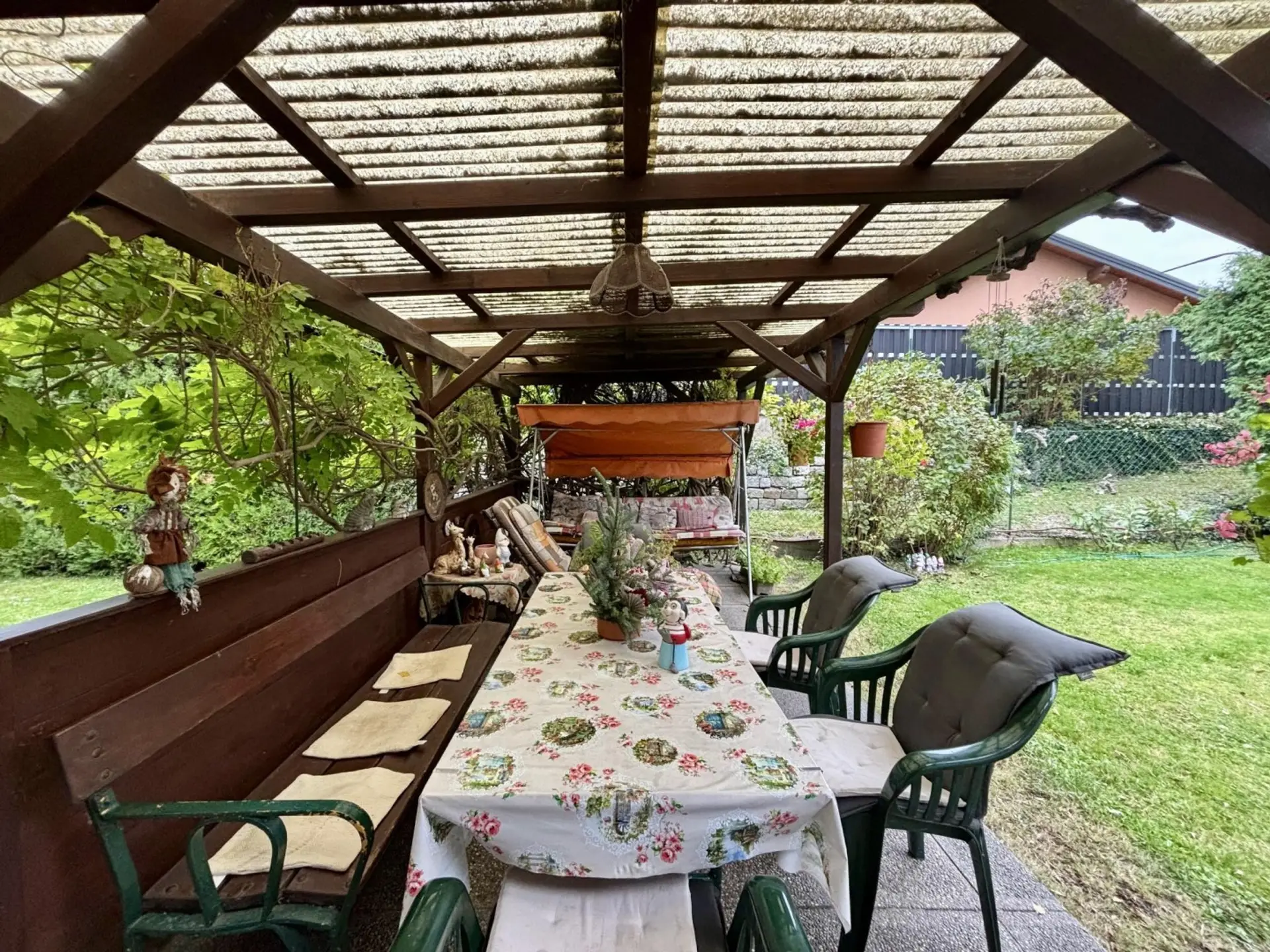 Ein gepflegter, grüner Garten, der mit ruhigen Ecken zum Verweilen einlädt – der perfekte Ort für entspannte Grillabende mit Freunden.