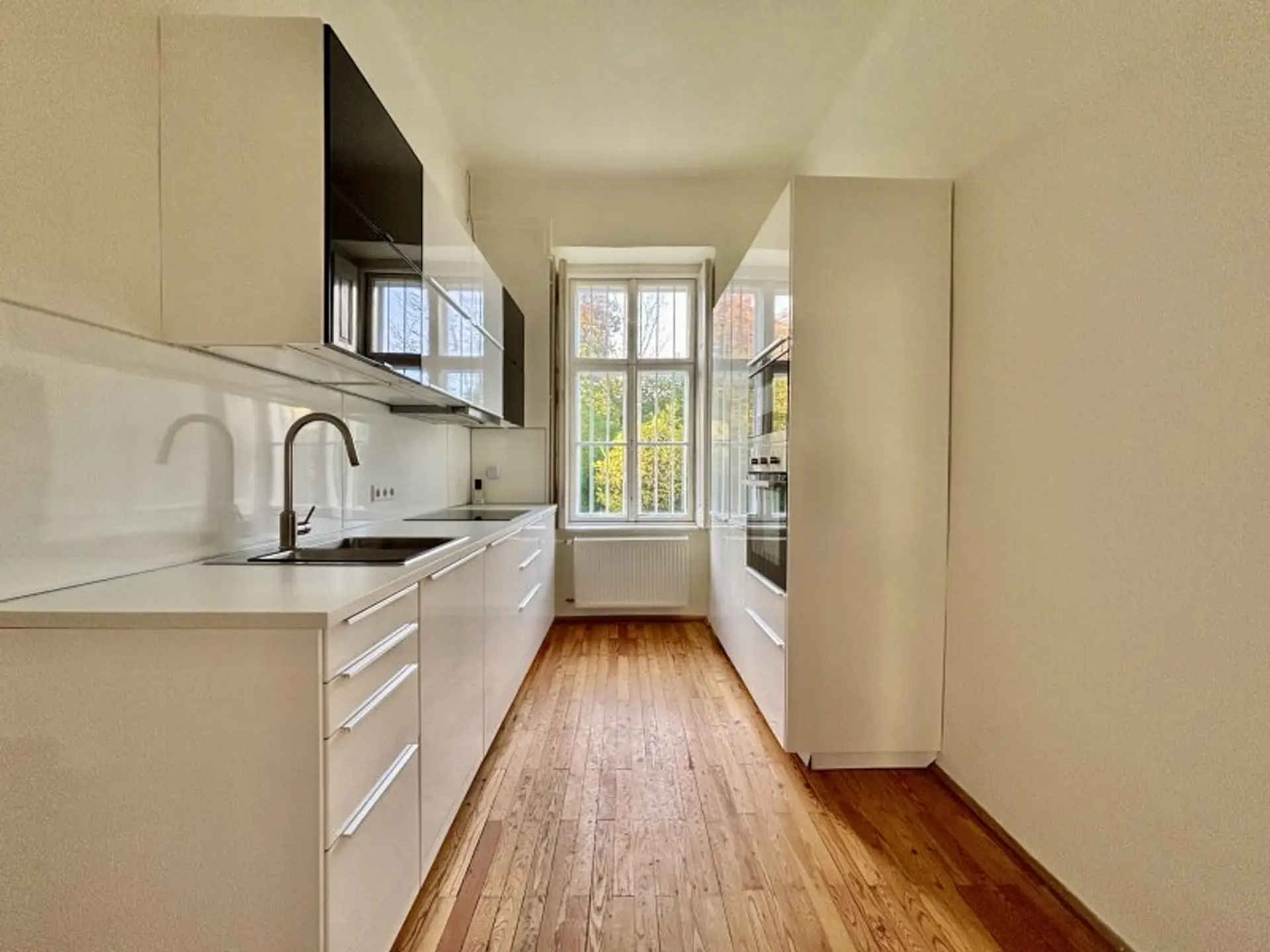 Das zentral begehbare Haus umfasst eine separate Küche, zwei große Zimmer mit angrenzendem Archivraum, ein offenes Zimmer, das sich hervorragend als zentraler Arbeits- oder Empfangsbereich eignet, ein Badezimmer mit WC, ein separates WC sowie einen Technikraum. Die typischen Altbau-Flügeltüren und hohen Räume unterstreichen den historischen Charakter des Hauses und verleihen ihm eine besondere Ausstrahlung.