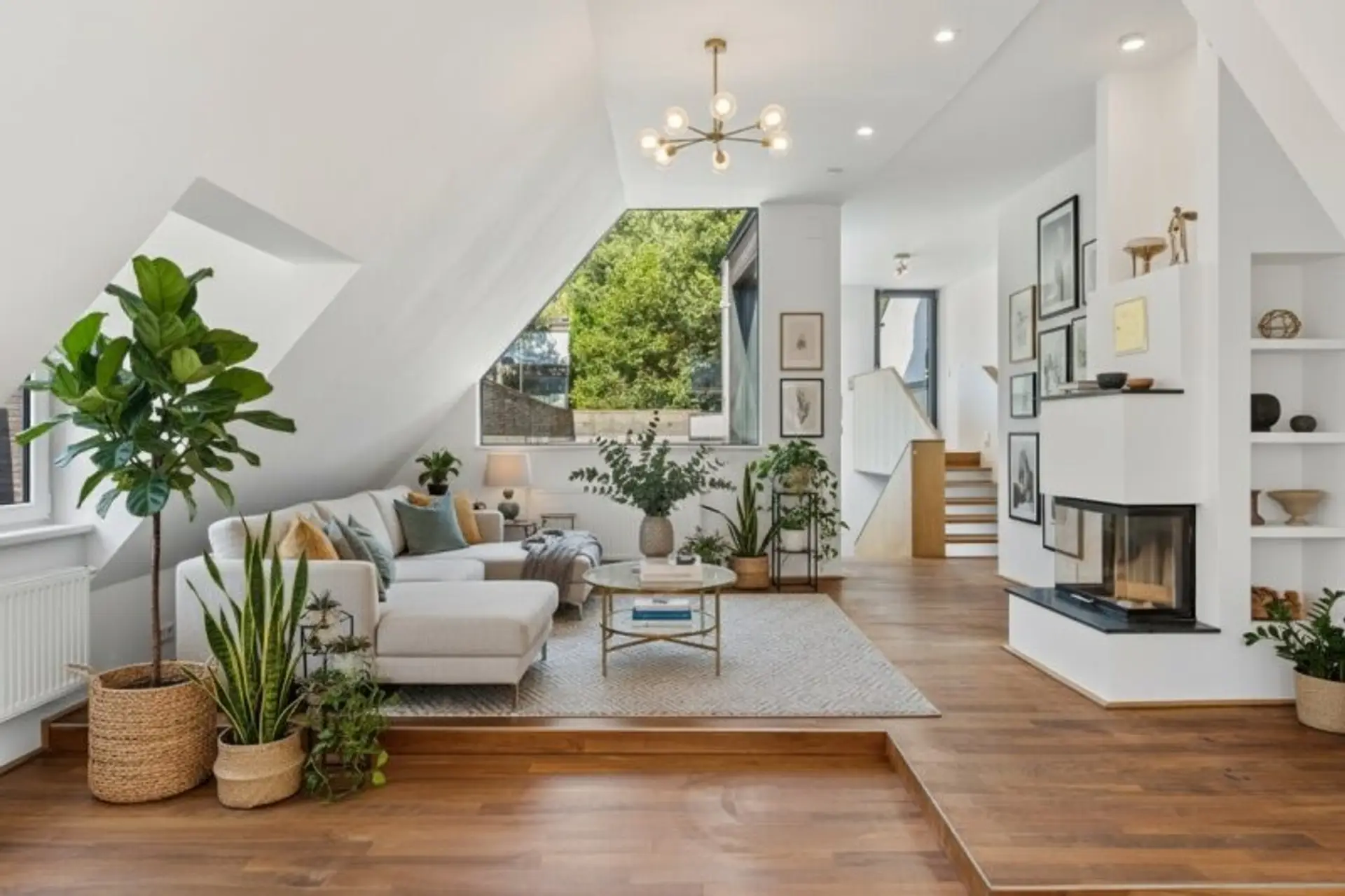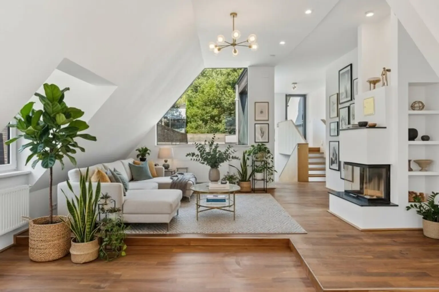 Schon auf den letzten Stufen erkennt man die außergewöhnliche Deckenhöhe und den beeindruckenden Schnitt des Wohn-Ess-Bereichs. An der höchsten Stelle sind es ca. 3,25m Höhe, so dass auch die zum Innenhof gelegenen Dachschrägen kaum mehr ins Gewicht fallen, sondern dem Raum vielmehr eine gemütliche Atmosphäre verleihen. Der an drei Seiten offene Kamin unterstreicht die besondere Atmosphäre des Raums.