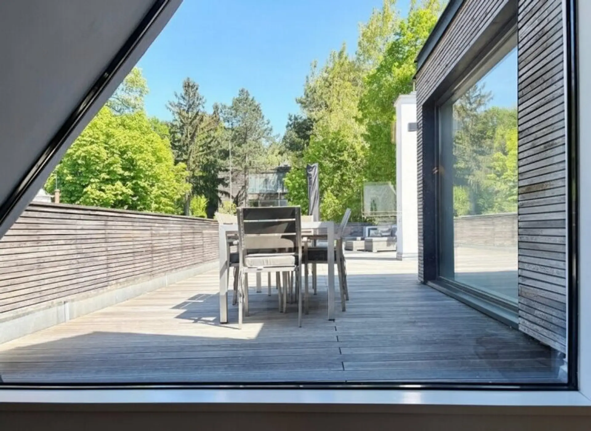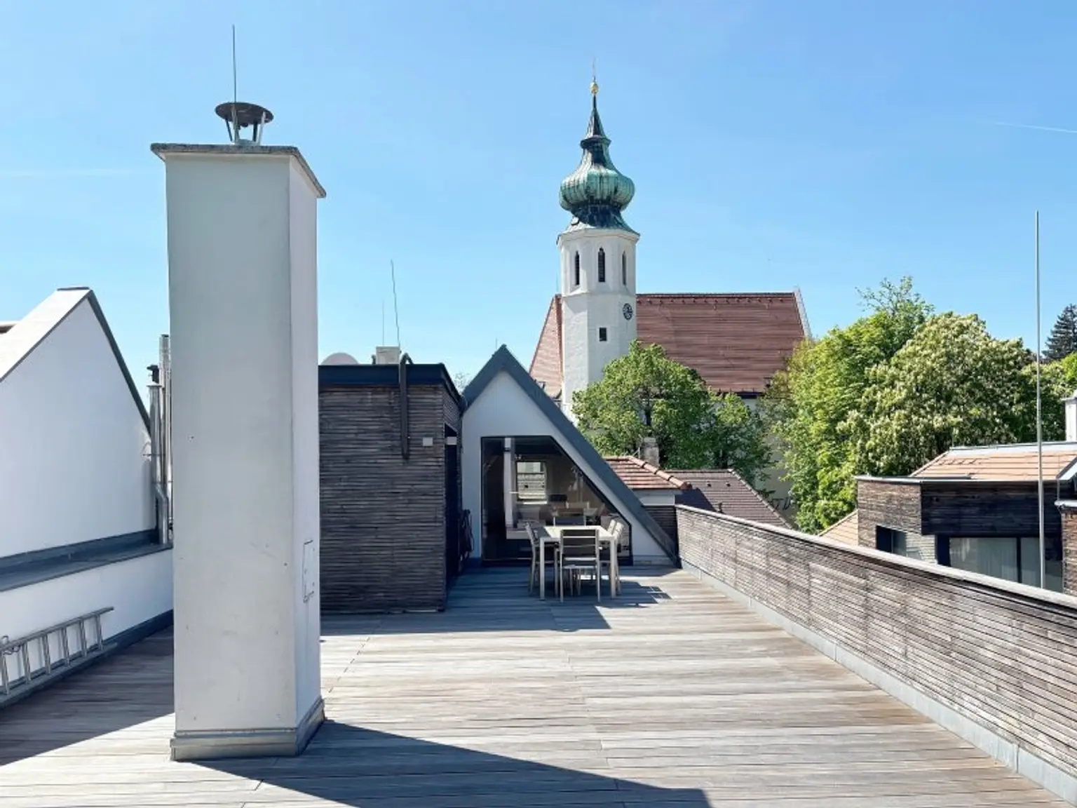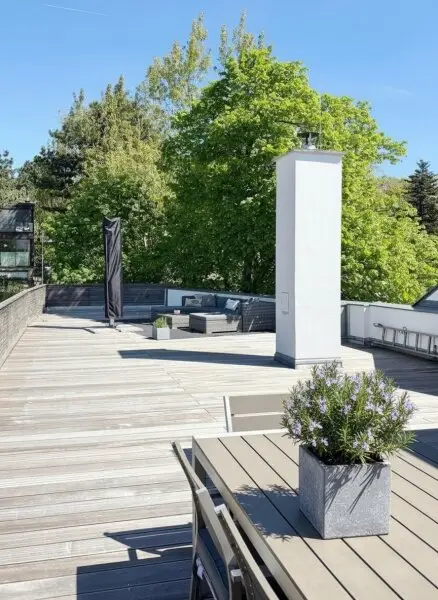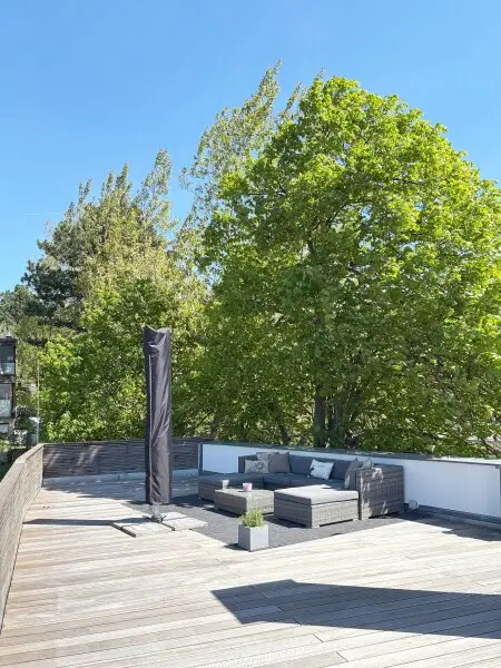 Desweiteren gibt es auch auf dieser Etage ein separates WC, welches sich am Aufgang zur ca. 92 m2 großen Terrasse befindet. Die Terrasse bietet aufgrund ihrer Größe Platz für alles, wovon man Outdoor träumen kann. Richtung Norden wird der Blick von den umliegenden Bäumen geleitet, Richtung Süden kommt erneut der Kirchturm ins Blickfeld.