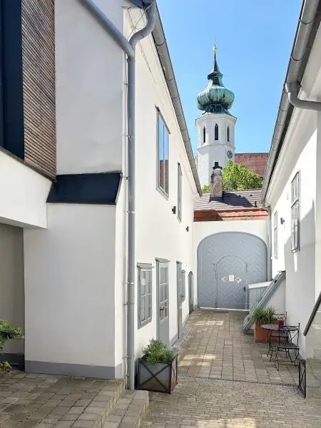 Schon der Zugang in den Innenhof ist beeindruckend - Altes und Neues passen hervorragend zusammen. Dreht man sich um, ergibt sich der Blick Richtung Kirchturm, der im gesamten Ensemble eingebettet zu sein scheint.
