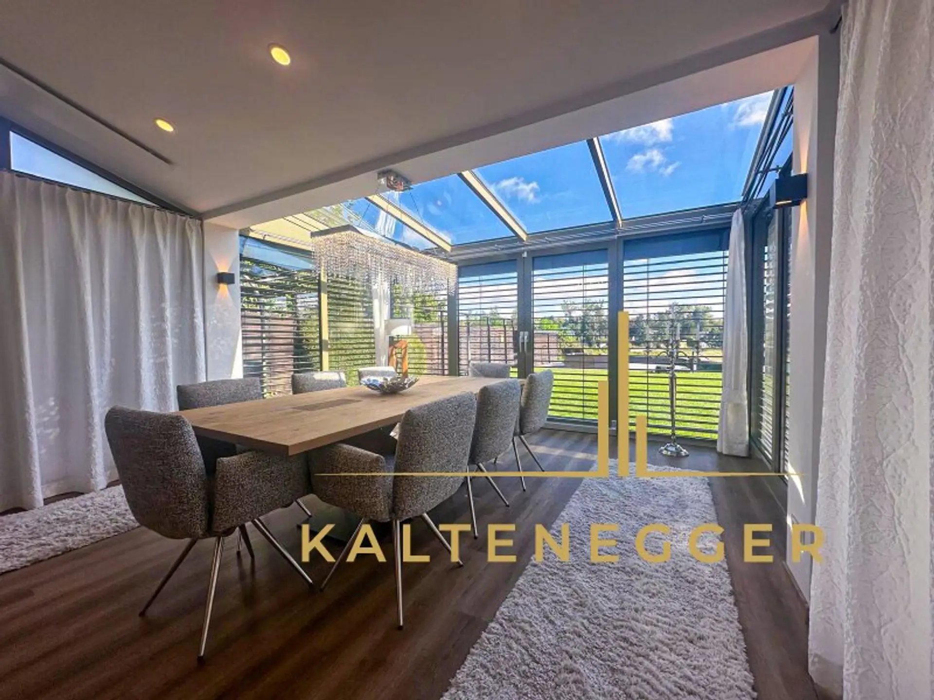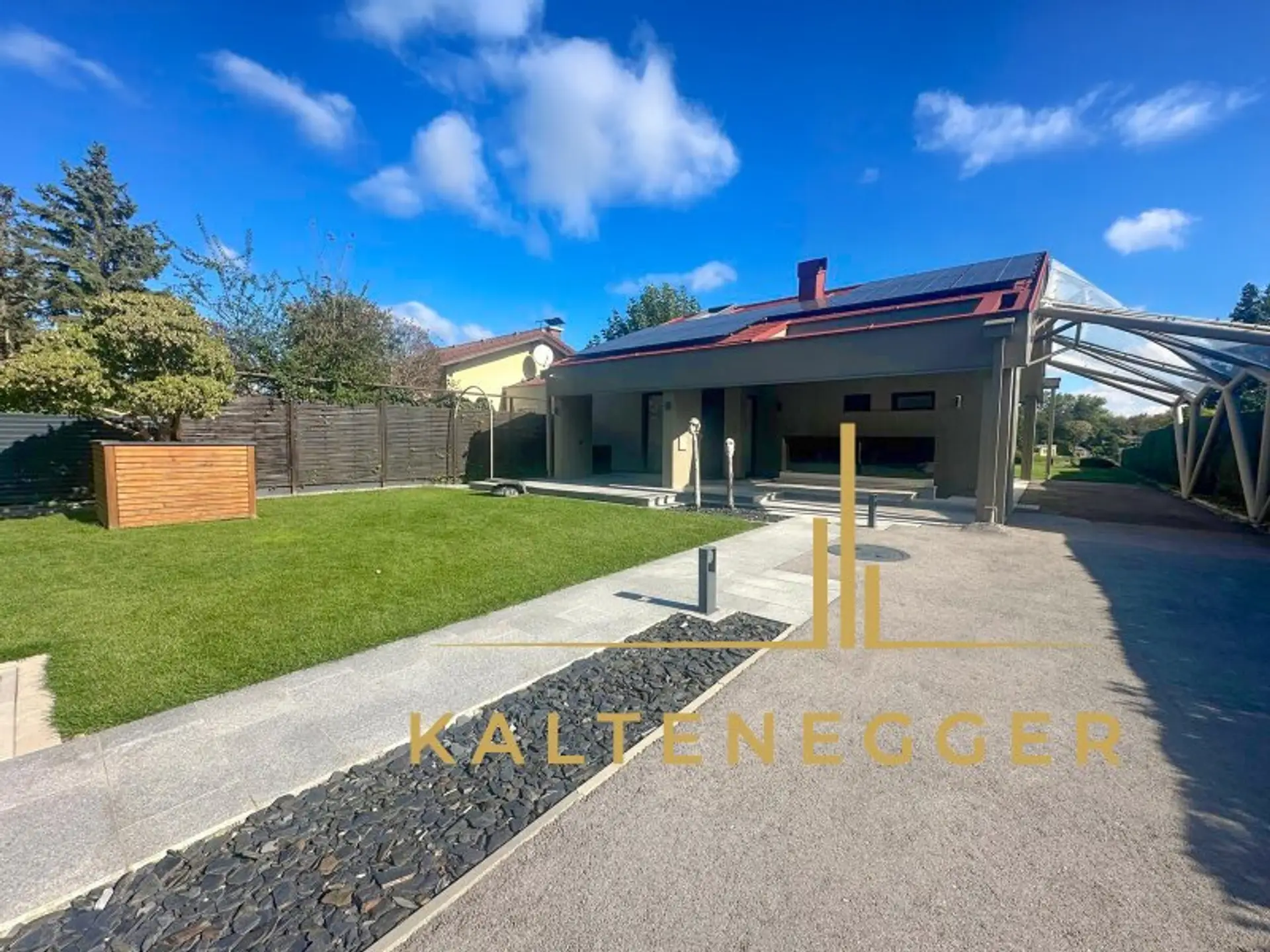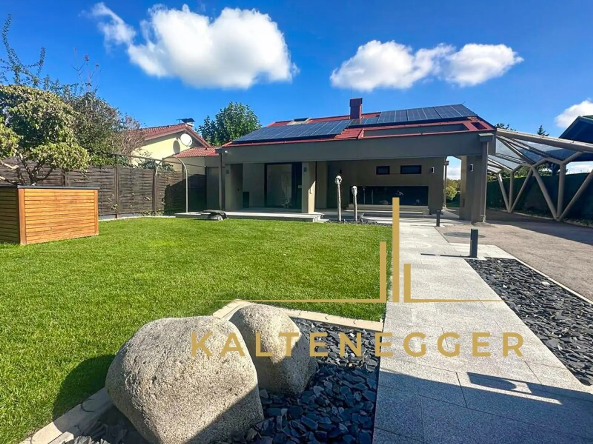 Das Haus wird nachhaltig mit Strom aus der hauseigenen Photovoltaikanlage beheizt. Überschüssige Energie wird in einer Batterie gespeichert und steht auch abends zur Verfügung – so wohnen Sie nicht nur stilvoll, sondern auch umweltbewusst.
