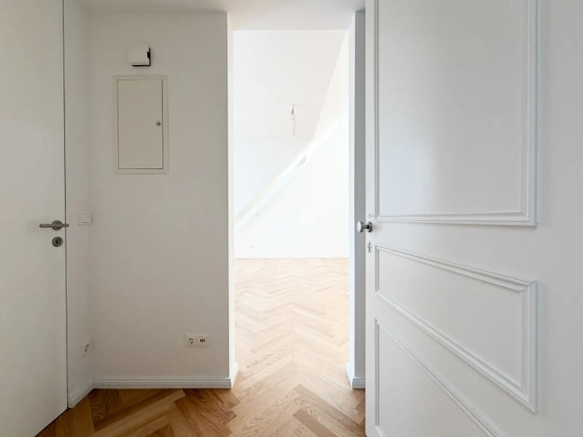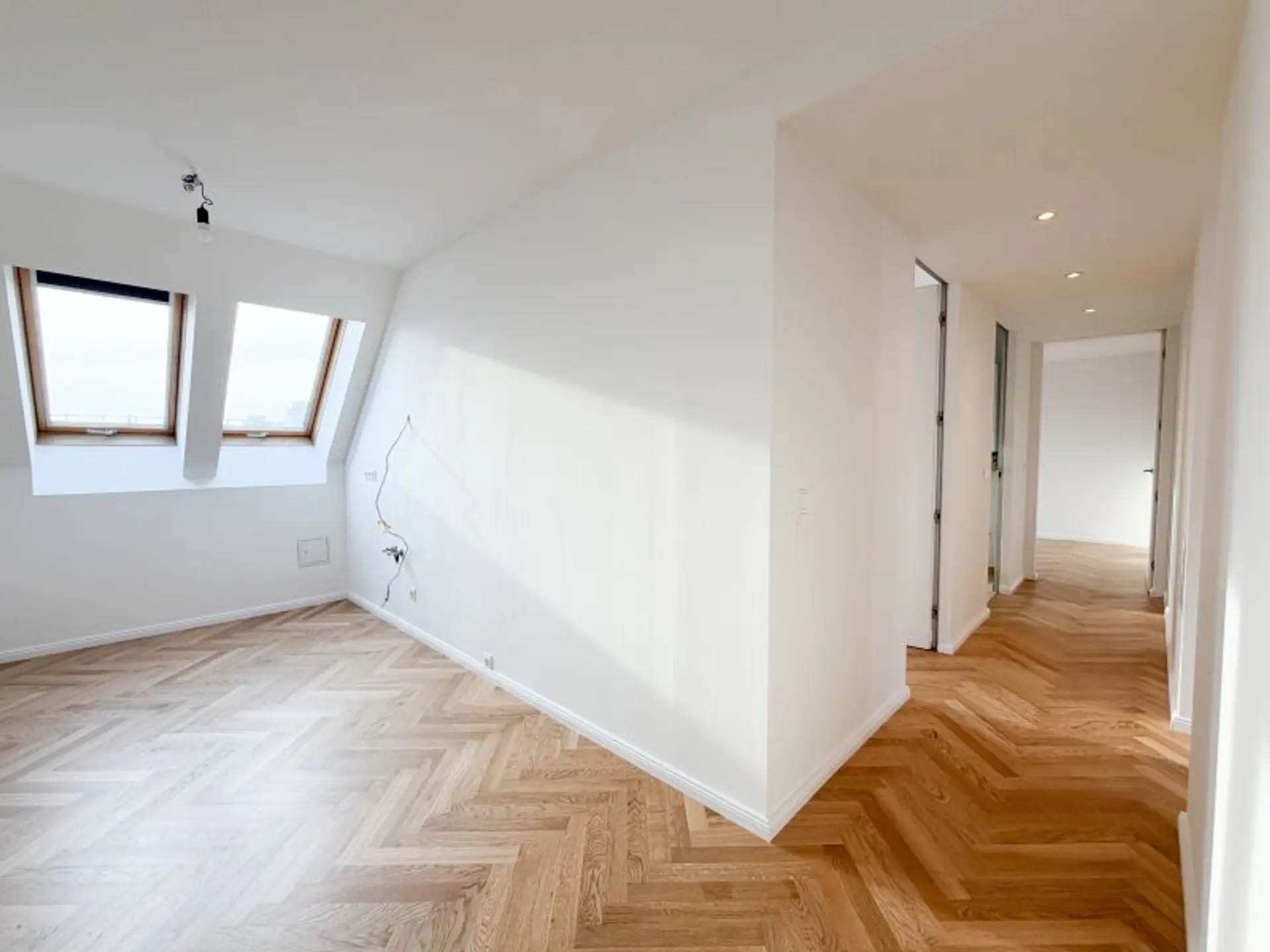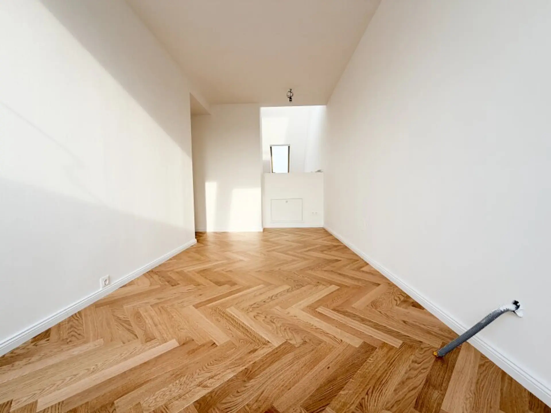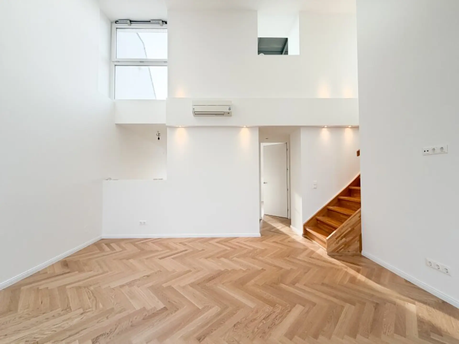 Auf rund 105 m² Wohnfläche entfaltet sich ein offenes, lichtdurchflutetes Wohnambiente, das insbesondere durch die beeindruckende Galerieebene und die außergewöhnliche Raumhöhe besticht. Bereits beim Betreten vermittelt die Wohnung ein Gefühl von Eleganz und Qualität: Frisch ausgemalt und mit einem stilvollen Fischgrätparkettboden versehen, entsteht eine zeitlose und zugleich exklusive Wohnatmosphäre.