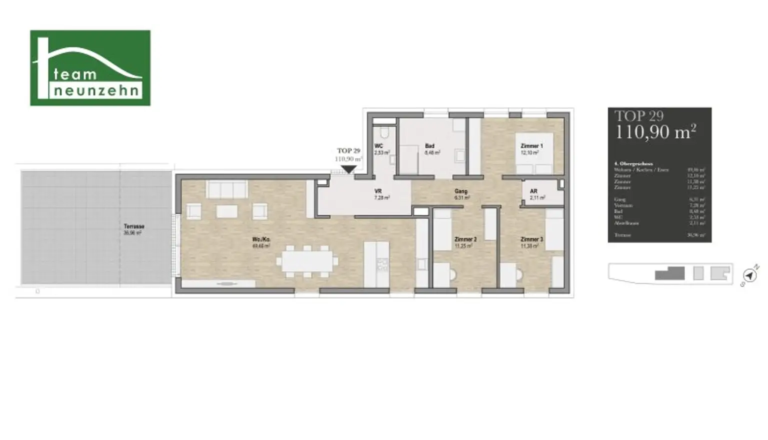 Die 4-Zimmer Wohnung mit ca. 110,90 m² Wohnfläche zzgl. ca. 36,96 m² Terrasse liegt im 4. Obergeschoss und gliedert sich in folgende tolle Raumaufteilung: