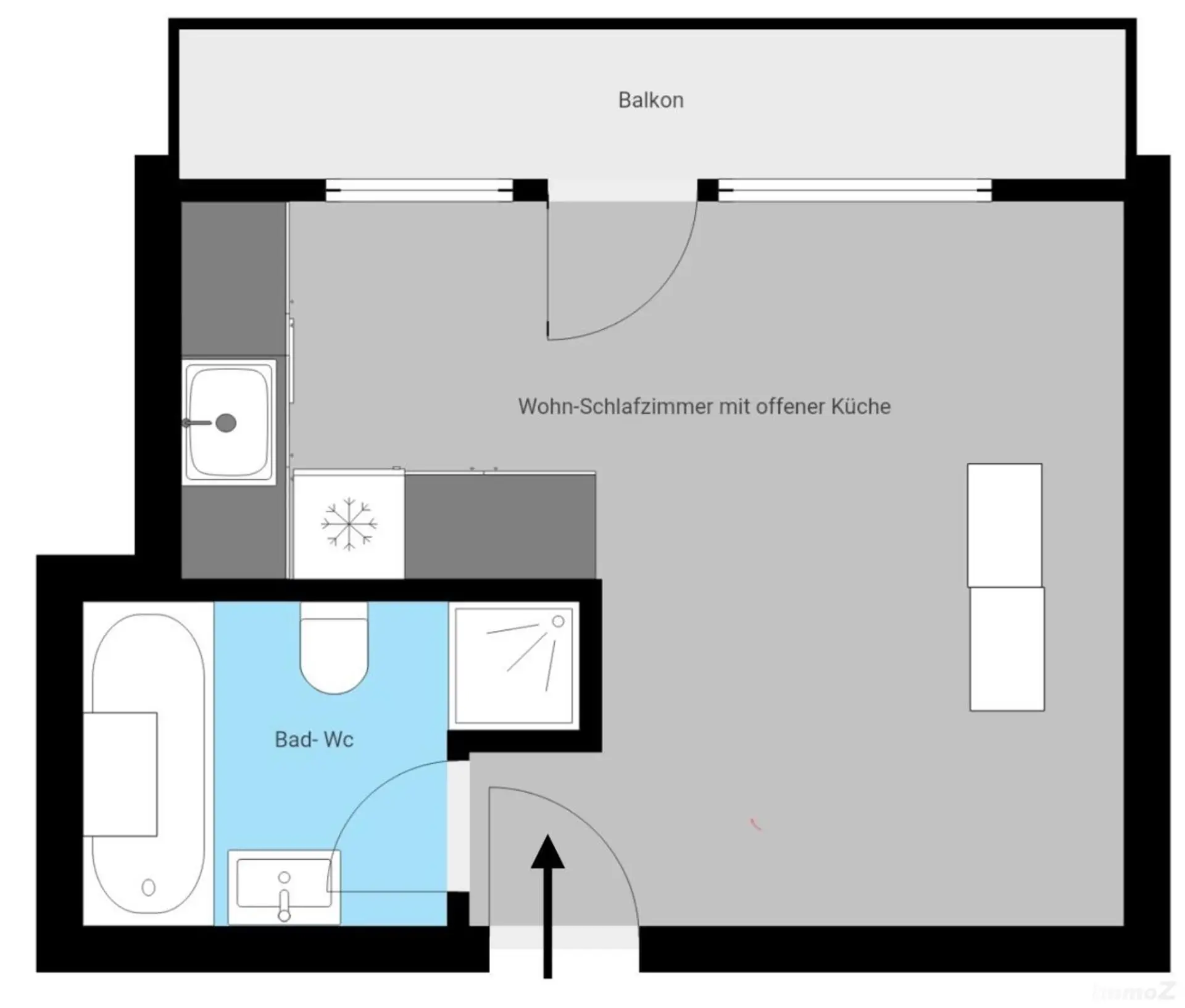 Die Wohnung besteht aus einem geräumigen Badezimmer mit WC, Fenster, Dusche und Badewanne, einem Wohn-Schlafraum mit offener Küche. Ein großer Balkon wertet das Wohnen noch auf.