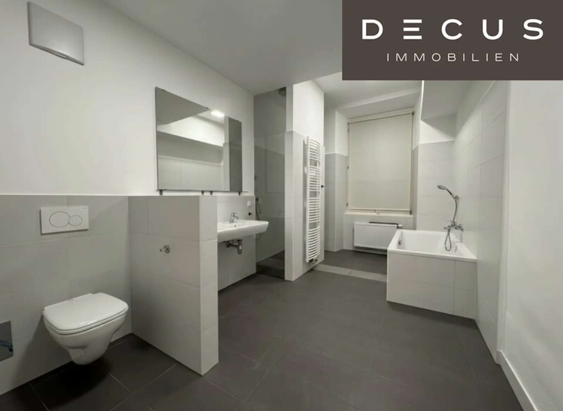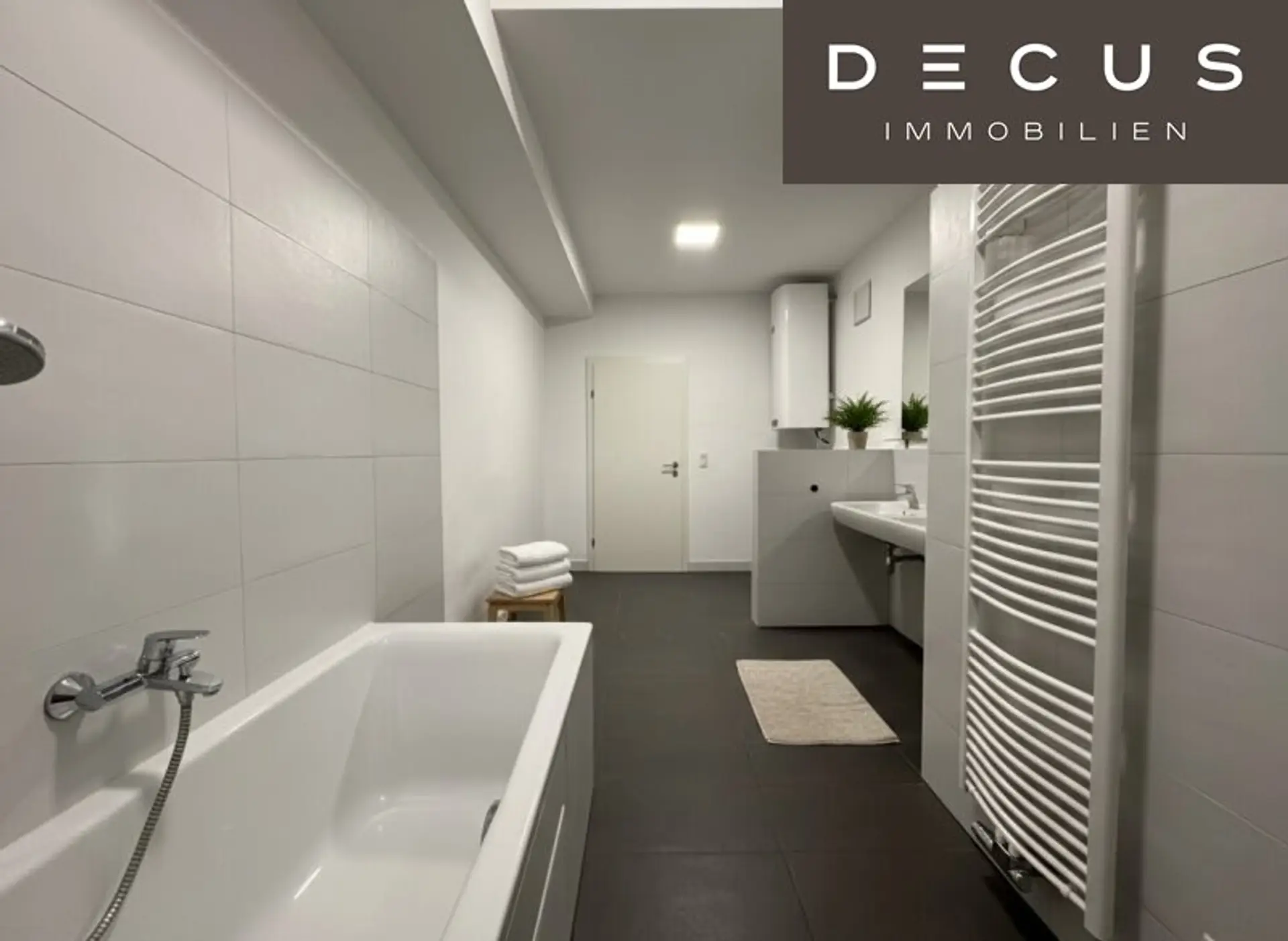 * Großzügiges Bad mit WC, Doppelwaschbecken, Dusche und Badewanne