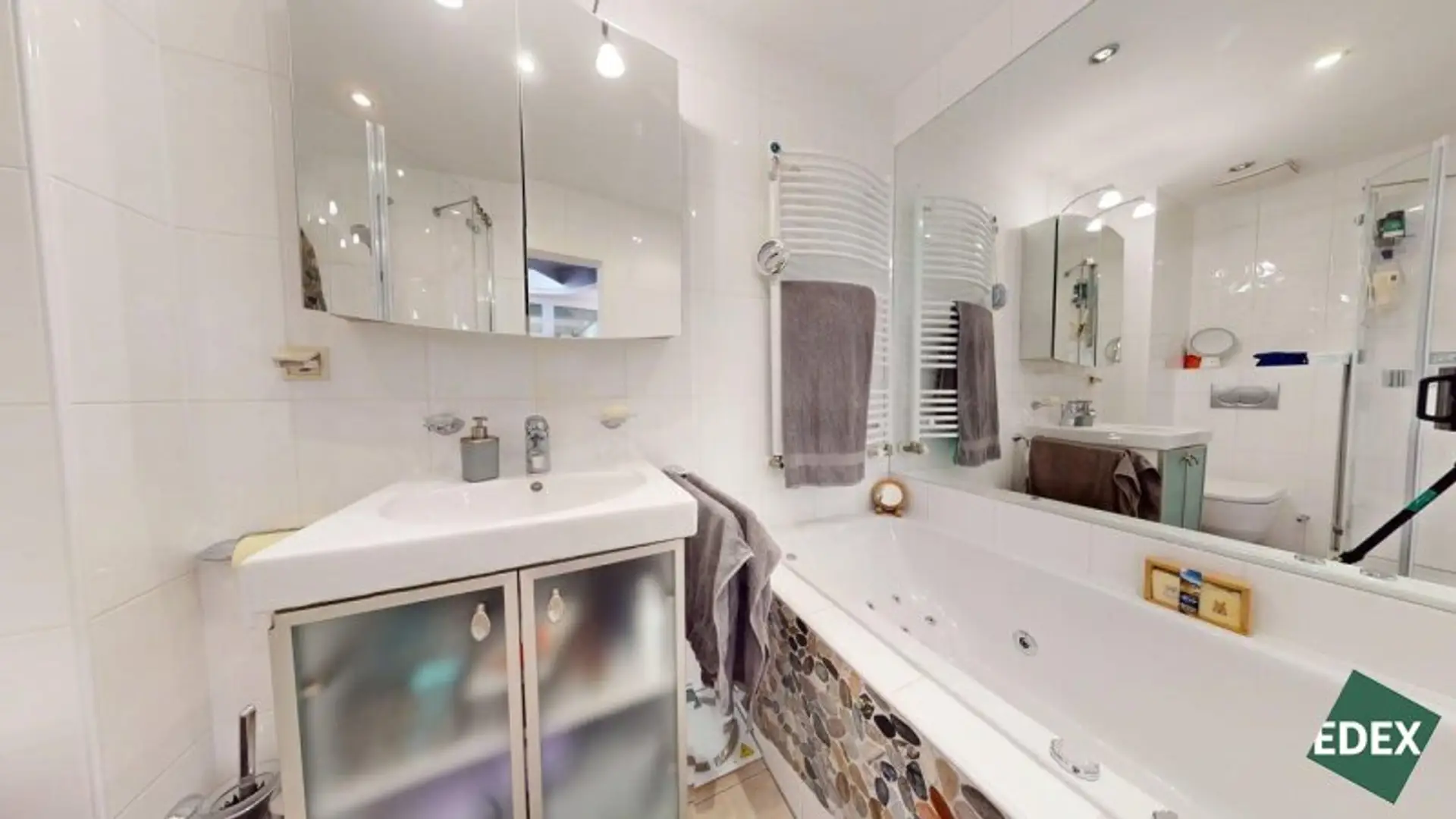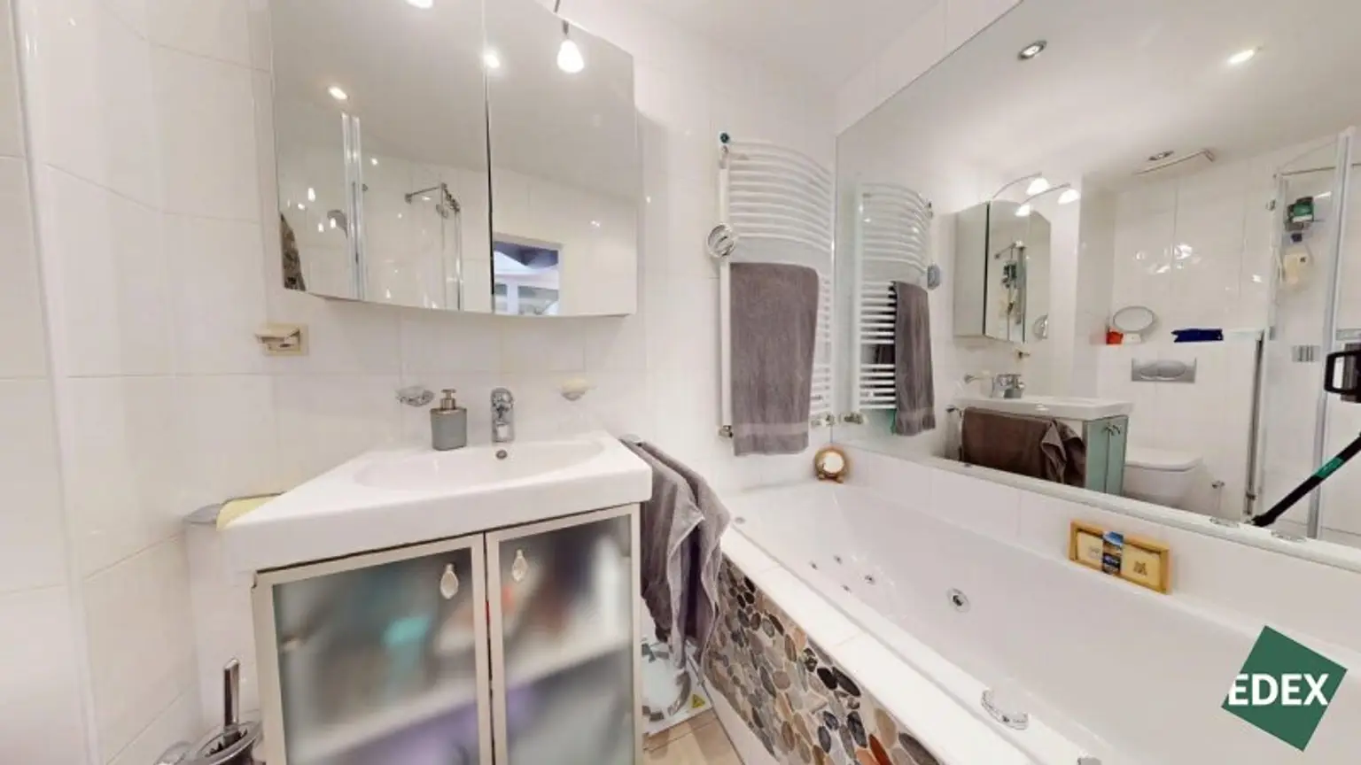 Badezimmer mit Dusche, WC und Badewanne mit Wirlpoolfunktion und Massagedüsen