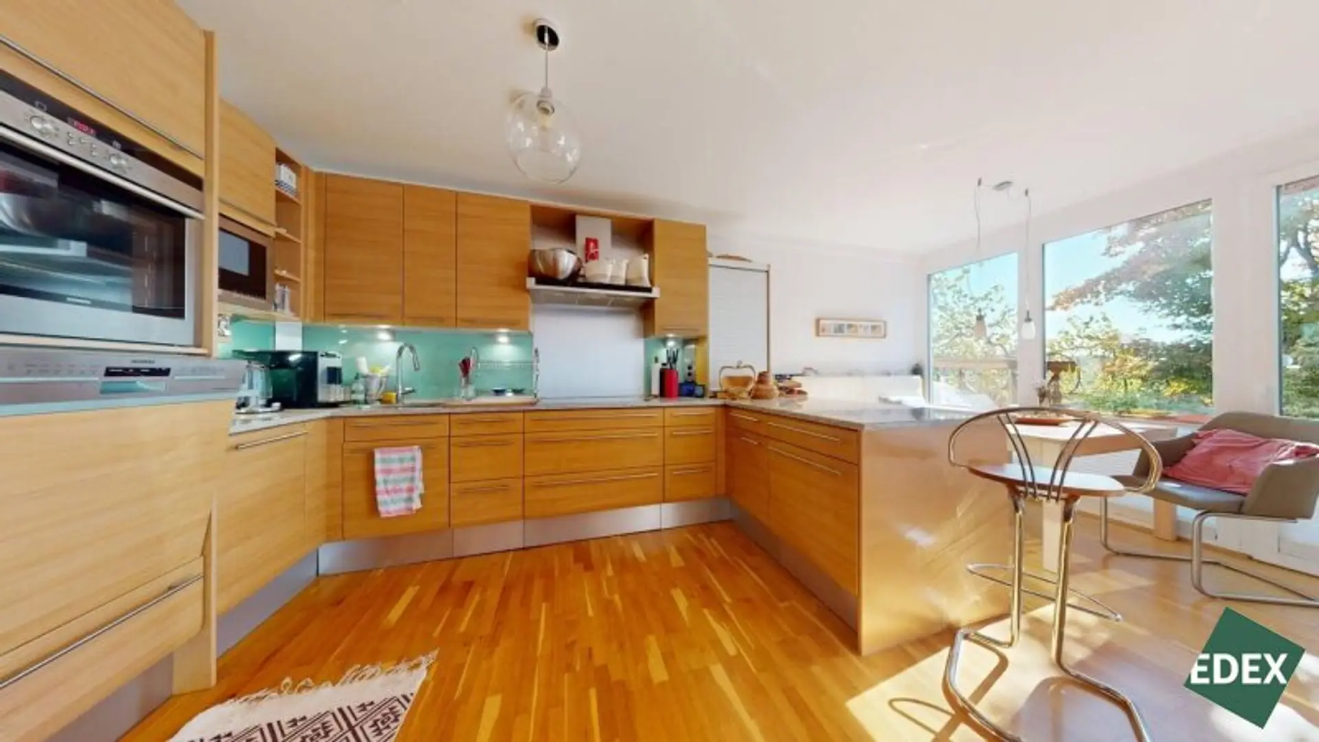 Großzügiger Wohn- und Essbereich mit offener Küche und hochwertigen Markengeräten