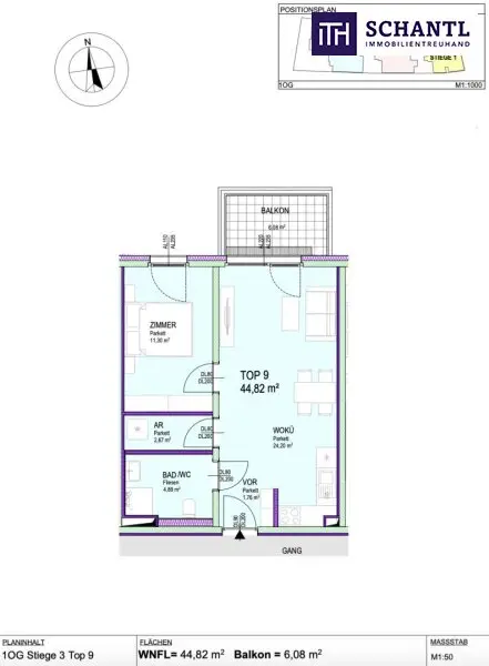 Wohnfläche: ca. 44,82 m² + Balkon: ca. 6,08 m² + Kellerabteil