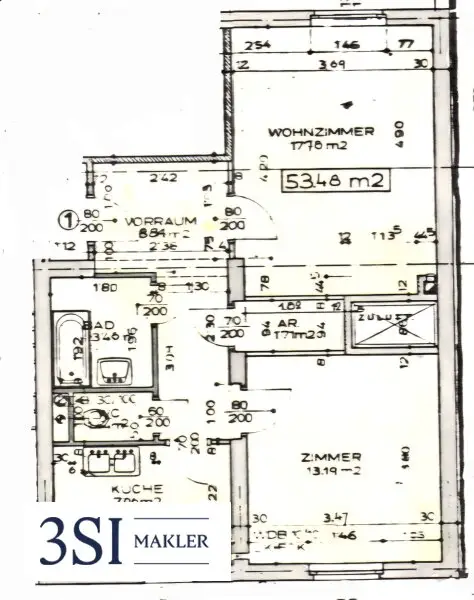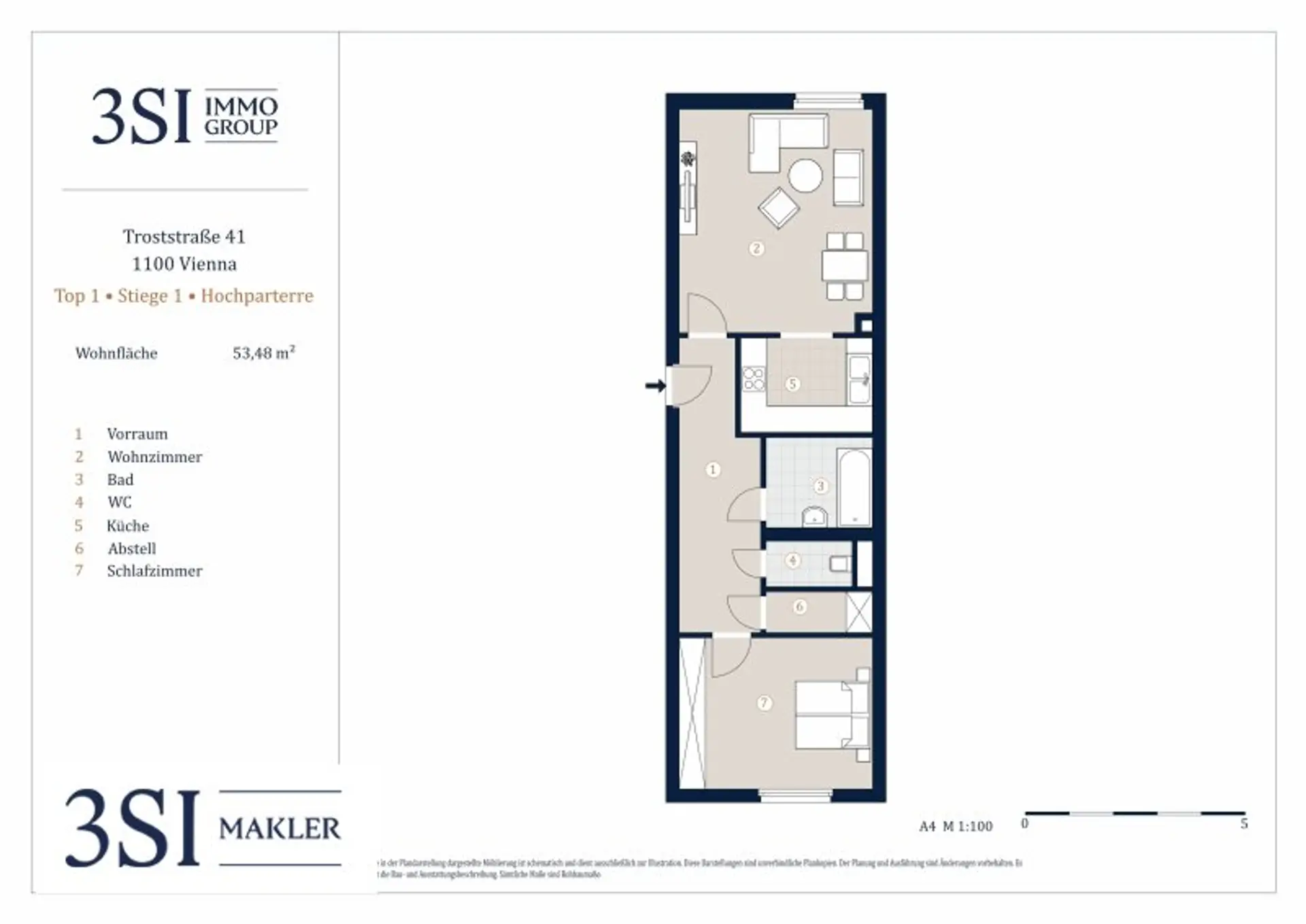 Beim Betreten der Wohnung öffnet sich ein zentraler Vorraum, von dem aus sämtliche Räume zugänglich sind. Das Wohnzimmer bietet ausreichend Platz für einen gemütlichen Wohn- und Essbereich und bildet den Mittelpunkt der Wohnung. Die separat geführte Küche präsentiert sich funktional und gut geschnitten, während das Schlafzimmer als angenehmer Rückzugsort dient. Ein praktischer Abstellraum schafft zusätzlichen Stauraum. Das Badezimmer ist kompakt und zweckmäßig gestaltet; ein separates WC erhöht den Wohnkomfort.