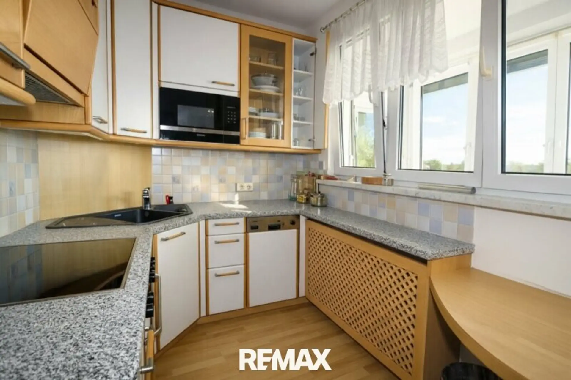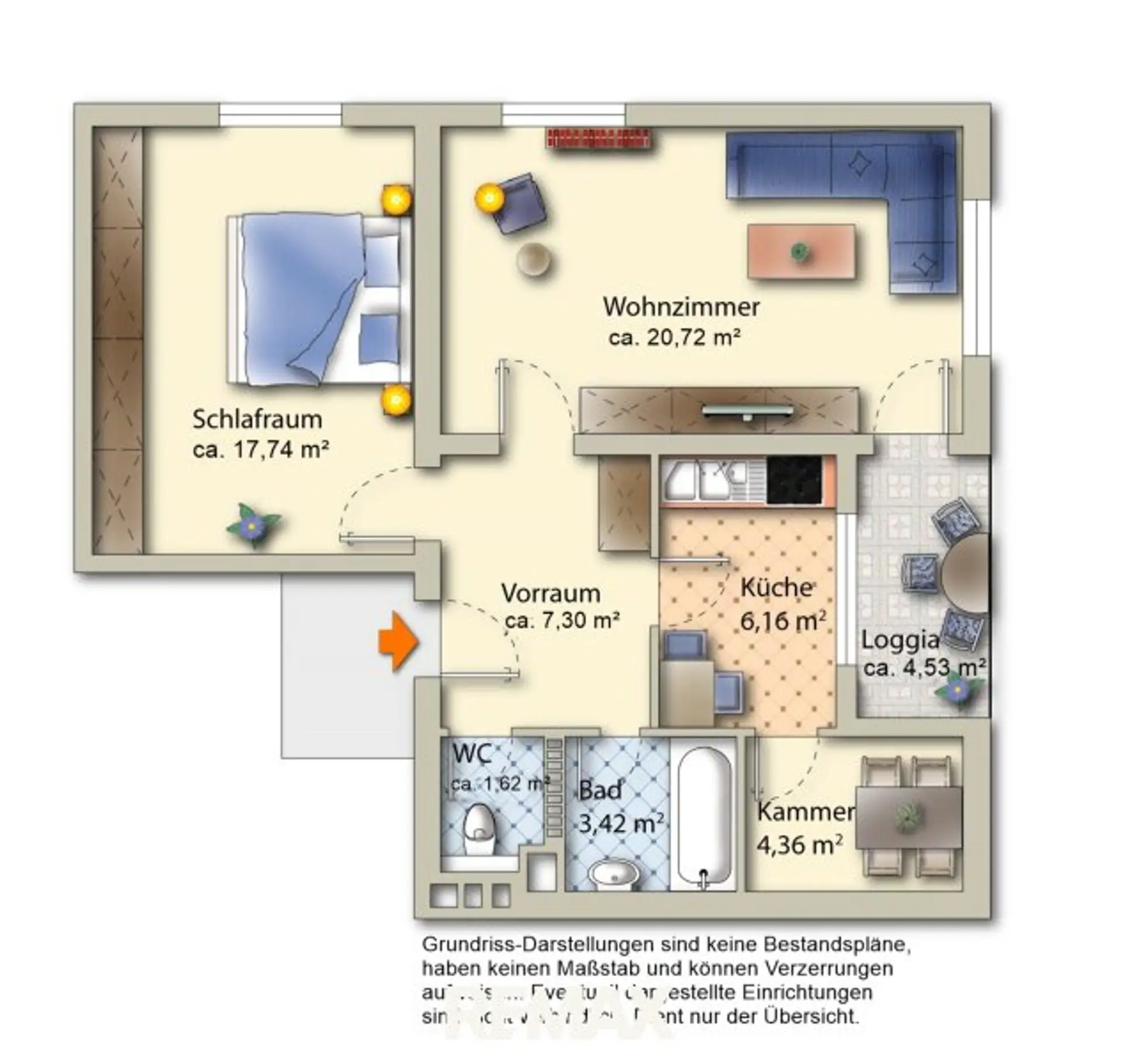 Auf rund 62,17 m² Wohnnutzfläche inklusive Loggia erwartet Sie eine praktische Raumaufteilung. Der Wohn- und Essbereich ist hell und freundlich gestaltet und bietet direkten Zugang zur Loggia. Die Küche ist vollständig ausgestattet und verfügt über einen zusätzlichen Abstellraum.