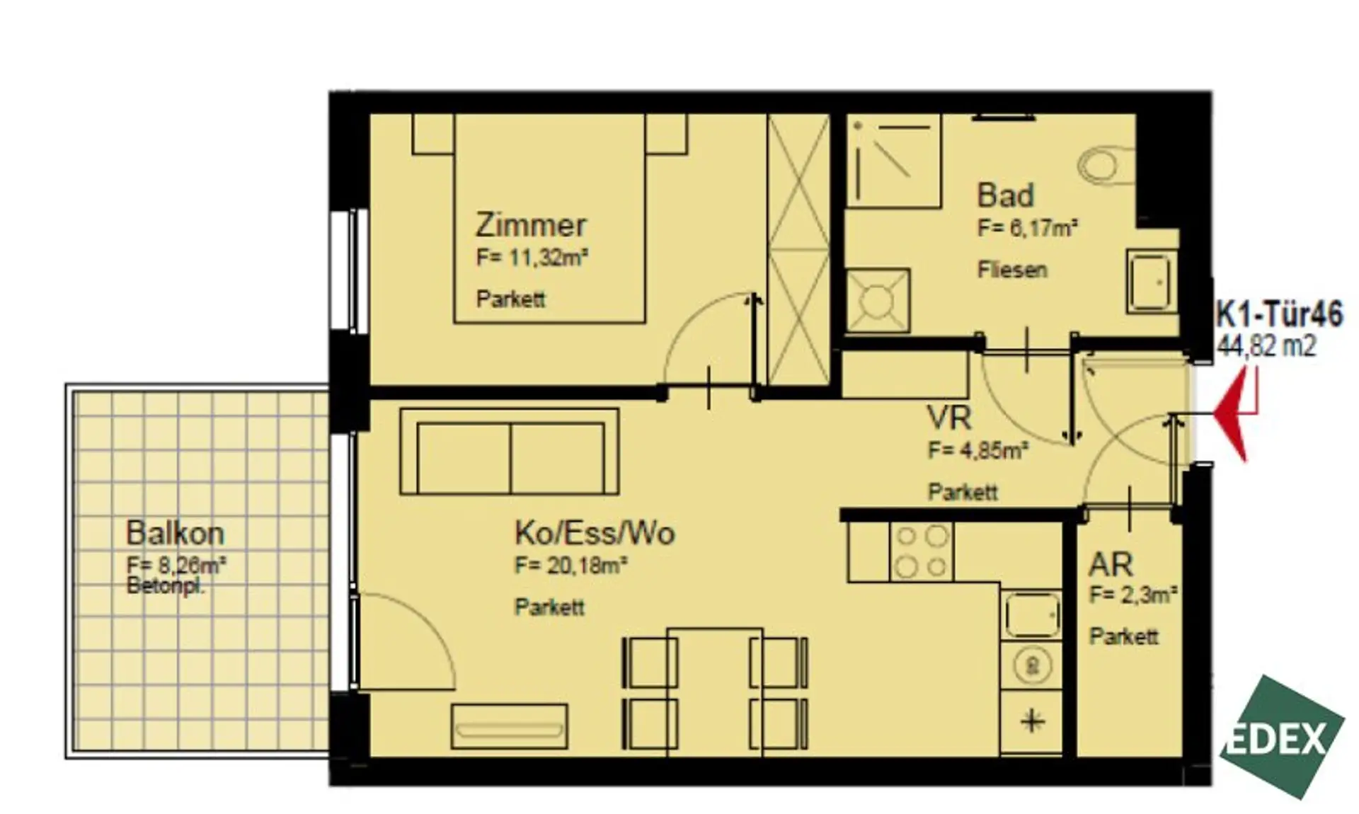 Die Wohnung gliedert sich in einen Vorraum, ein Badezimmer mit Dusche, WC und Waschmaschinenanschluss, einen großzügigen Wohn-/Essbereich mit offener Küche, ein Schlafzimmer sowie einen Balkon. Ergänzt wird das Raumangebot durch einen Abstellraum.