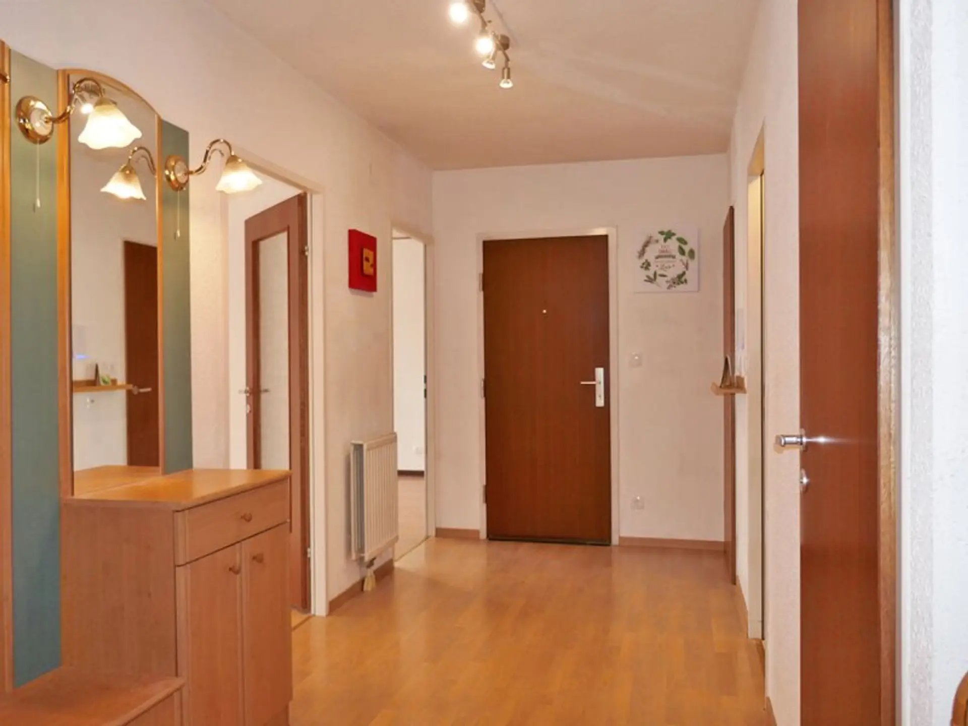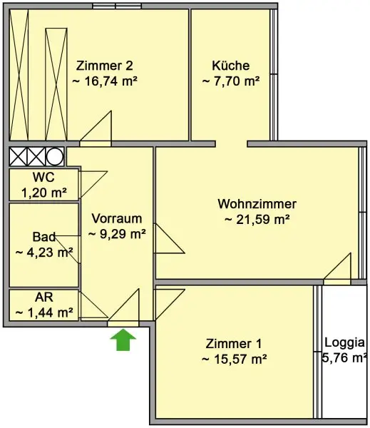 Die etwa 77 m² große Wohnung liegt im 1. Stock ohne Lift und unterteilt sich in einen Vorraum, ein Wohnzimmer mit Zugang zu Loggia und Küche, zwei Zimmer, Wannenbad, separates WC und Abstellraum. Das nordseitige Zimmer bietet eine begehbare Garderobe. Die Beheizung erfolgt mittels Gas-Etagenheizung über Radiatoren. Als zusätzlicher Stauraum dient ein ca. 6 m² großes Kellerabteil. Ein Fahrrad-/Kinderwagenabstellraum steht allen Bewohnern zur Verfügung.