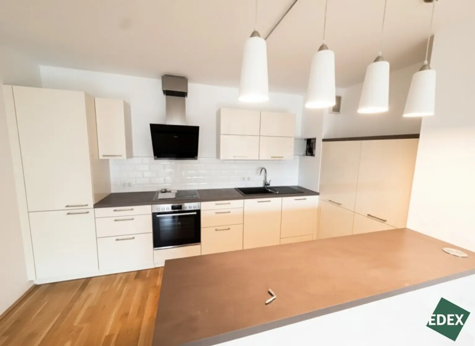 Der helle Wohnraum mit offenen Kochbereich (ausgestattet mit einem Backofen, Herd, Kühlschrank mit Gefrierfach, Geschirrspüler) bildet das Herzstück der Wohnung und schafft ein angenehmes Wohnambiente.