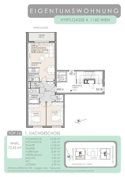 Die Wohnung liegt in der Hyrtlgasse im 16. Wiener Gemeindebezirk. Die Geschäfte des täglichen Bedarfs sind fußläufig erreichbar und in unmittelbarer Umgebung, wie etwa Billa und Spar in 5 Gehminuten. Auch diverse Restaurants und Lokale befinden sich in Gehweite.