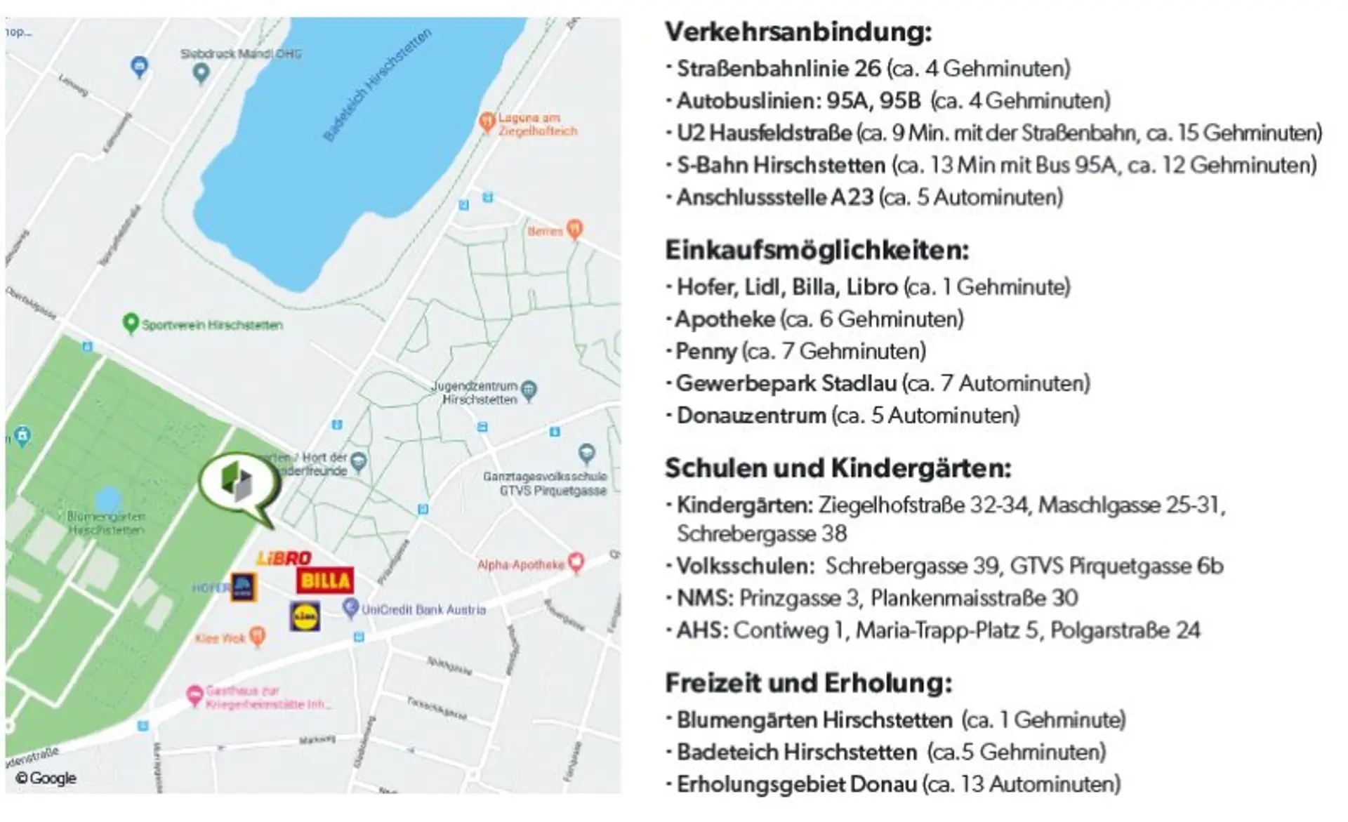 Die Liegenschaft befindet sich in ruhiger Wohnlage im 22. Bezirk, Donaustadt, einem der grünsten Bezirke von Wien. Die Umgebung ist geprägt von moderner Wohnbebauung, viel Freiraum und ausgezeichneter Infrastruktur.