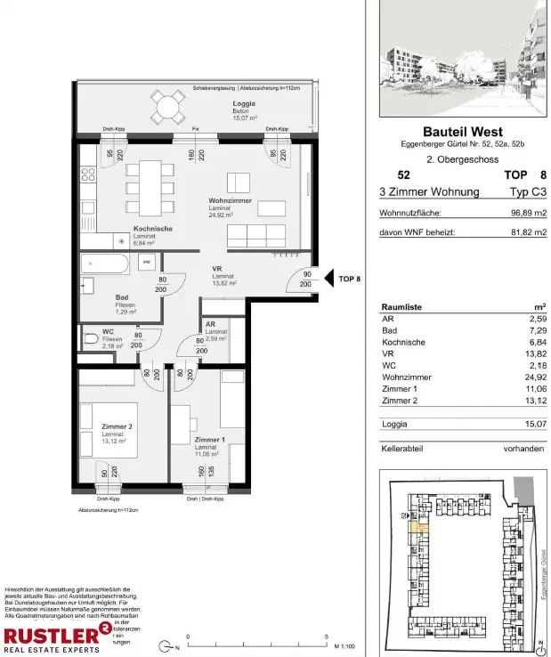 Diese ca. 96,89 m² große 3-Zimmerwohnung befindet sich im 2. Obergeschoss mit Lift. Sie gliedert sich in folgende Räumlichkeiten: - Vorraum - Wohnzimmer mit Kochnische - 2 Schlafzimmer - Badezimmer mit Badewanne - separates WC - Abstellraum - Loggia Diese Wohnung wird ohne Kücheneinrichtung vermietet. Die Bruttomiete setzt sich zusammen aus: Hauptmietzins, Betriebskosten und Umsatzsteuer. Heizkosten und Energiekosten sind nicht enthalten. Lage und Infrastruktur: In unmittelbarer Nähe befinden sich zahlreiche Einkaufsmöglichkeiten wie Spar, Interspar und das Einkaufszentrum Citypark. Die Anbindung an öffentlichen Verkehr ist durch die Nähe zum Grazer Hauptbahnhof hervorragend. Für die Freizeitgestaltung stehen Parks wie der Josef-Huber- oder Oeverseepark sowie Restaurants, Cafés und kulturelle Einrichtungen in der Umgebung zur Verfügung. Mietbeginn: ab sofort Mietdauer: unbefristet Jetzt online anfragen oder anrufen – wir melden uns zeitnah mit Terminvorschlägen.Weitere Immobilien finden Sie auf unserer a href="https://rustler.eu/"Homepagea_