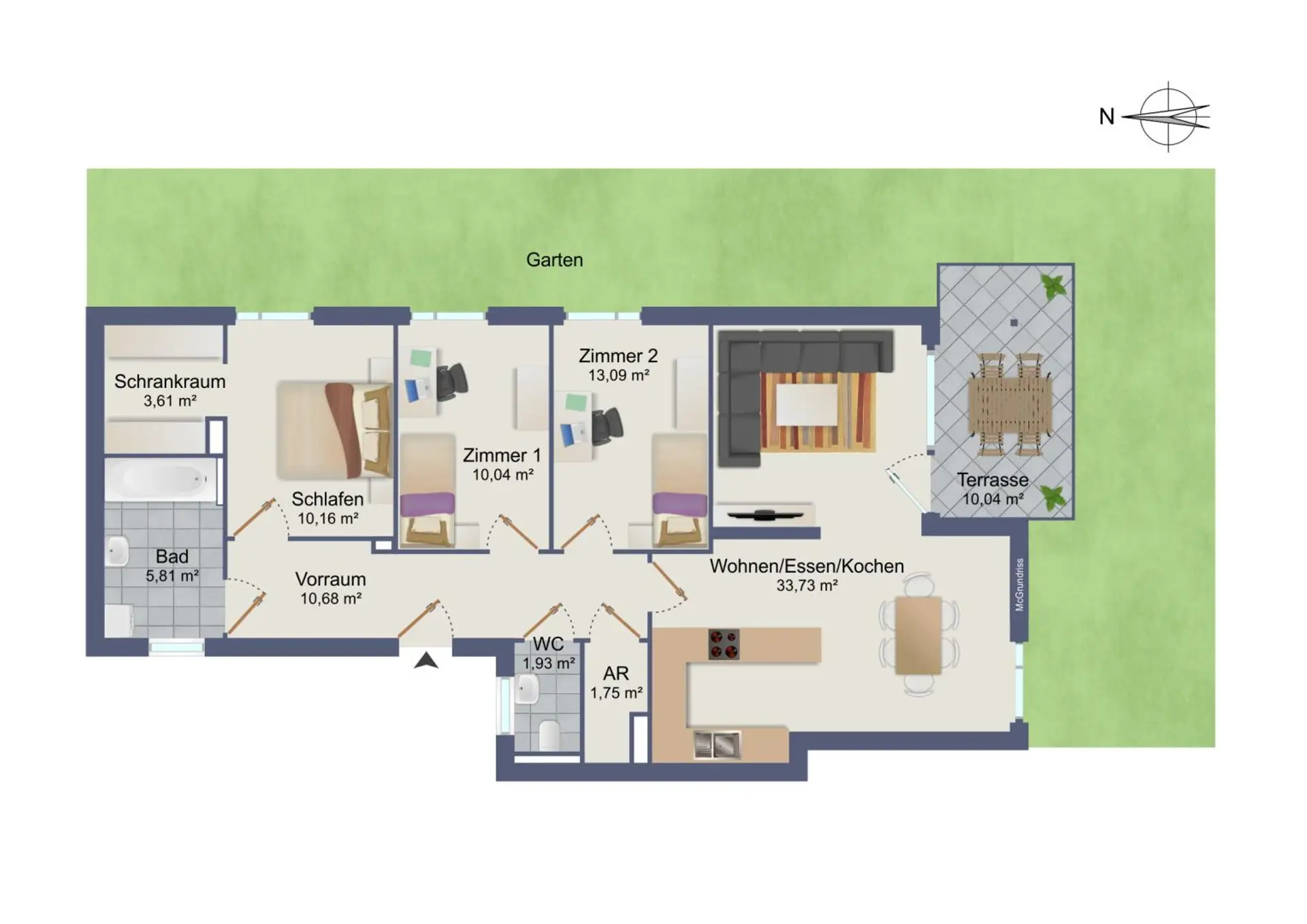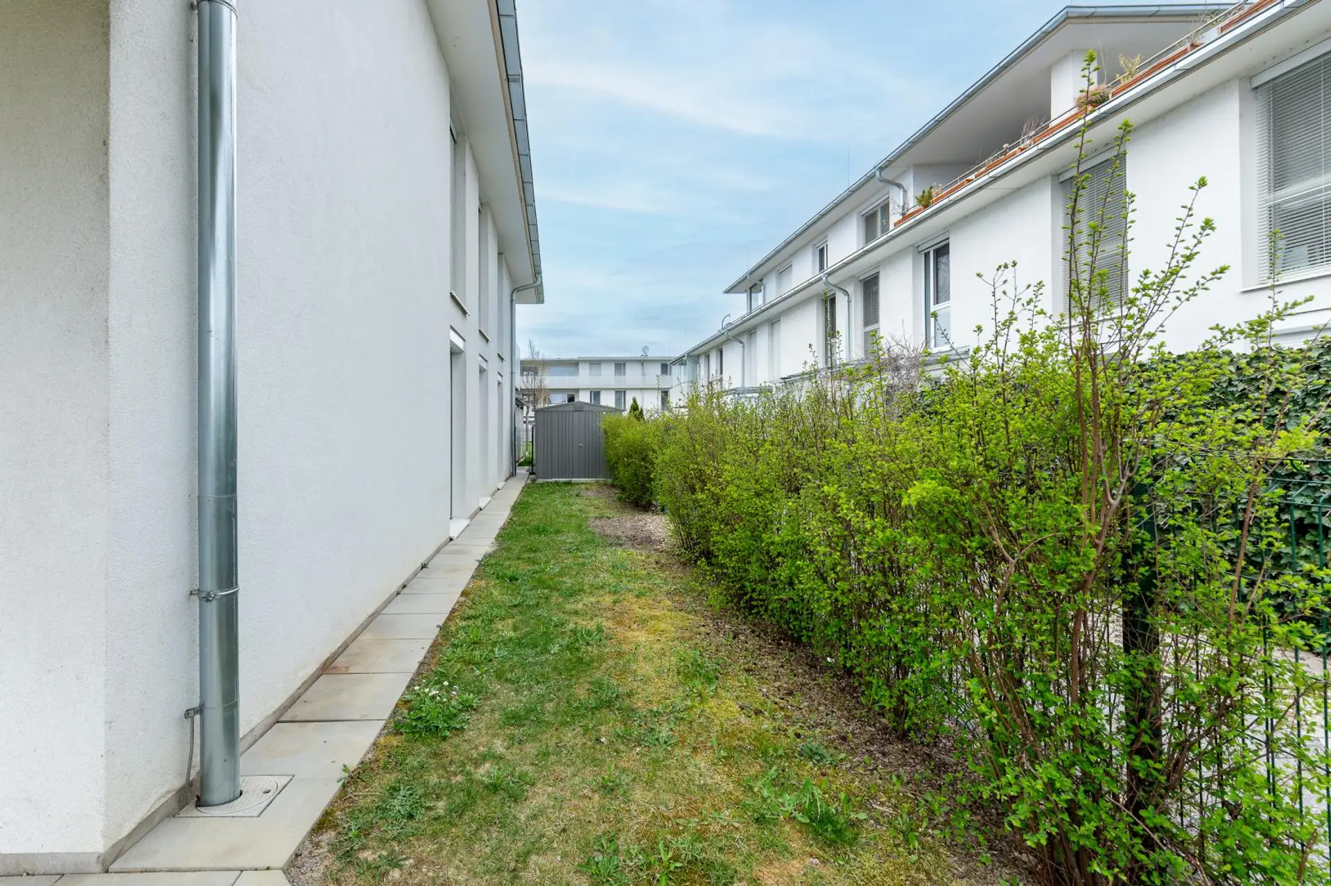 Die Wohnfläche beträgt ca. 90 m² und wird ergänzt durch eine Terrasse (ca. 10 m²) sowie einen Eigengarten (ca. 110 m²) – perfekt für Erholung und Freizeit im Freien. Ein Kellerabteil (ca. 4 m²) ist ebenfalls vorhanden.