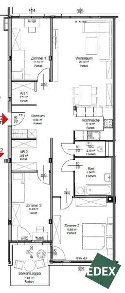 Vom Wohnbereich bzw. einem der Zimmer aus gelangt man auf die Balkon-/Loggiafläche mit ca. 7,10 m², die zusätzlichen Freiraum im Außenbereich bietet.