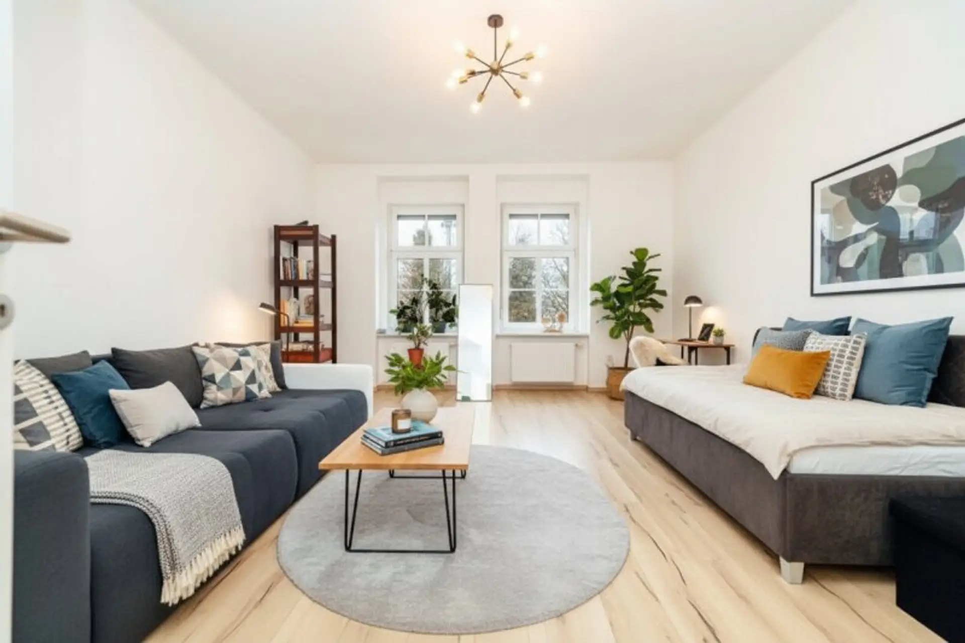 Die beiden separat begehbaren Zimmer sind in etwa gleich groß und durch ihre quadratische Form leicht einzurichten – ideal als Schlafzimmer, Büro oder Kinderzimmer.