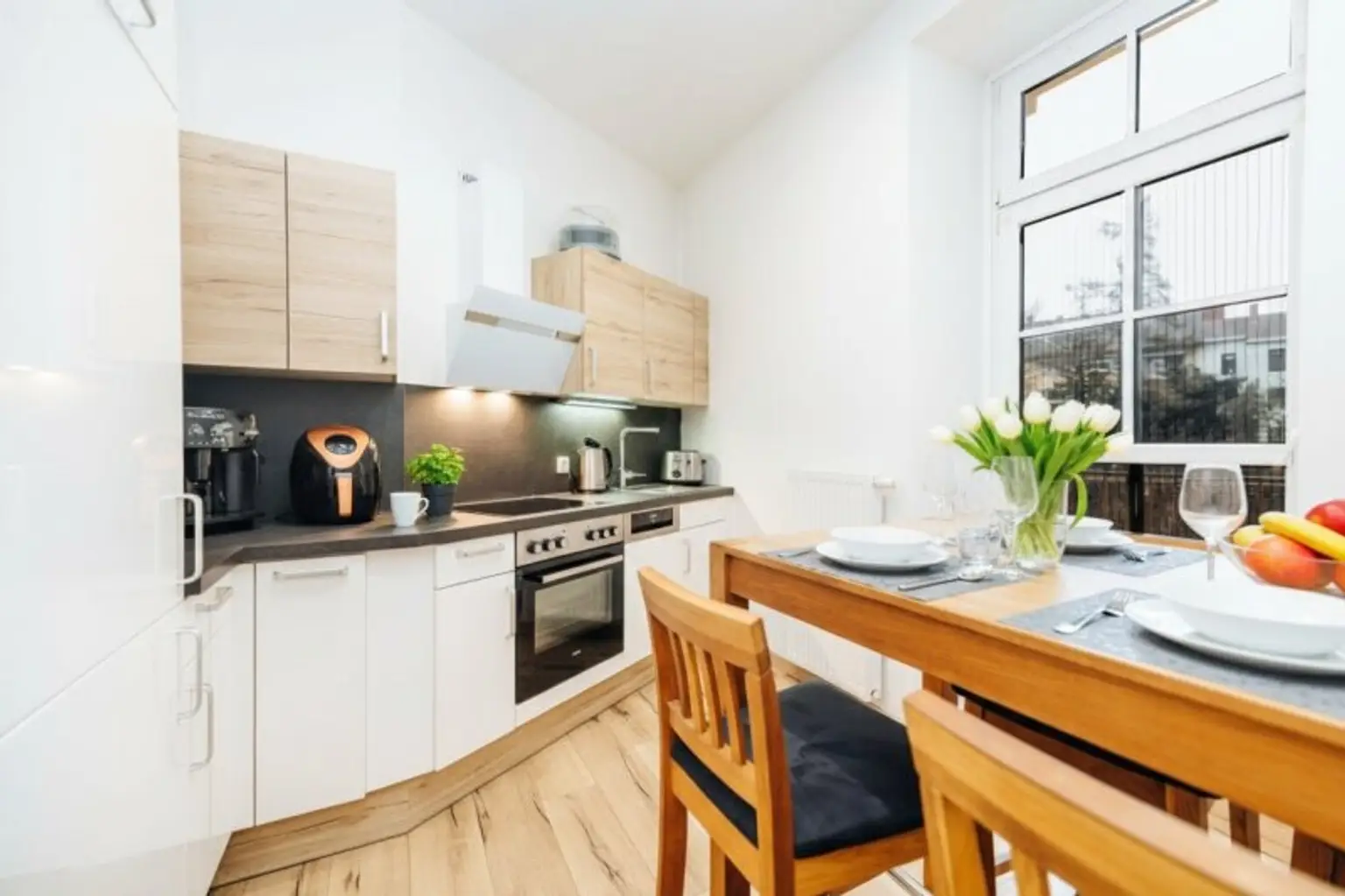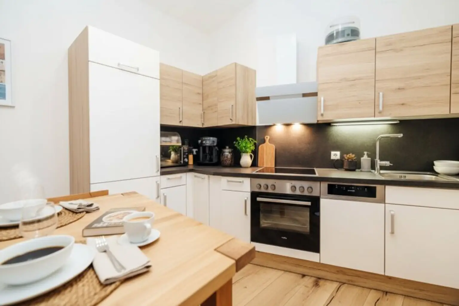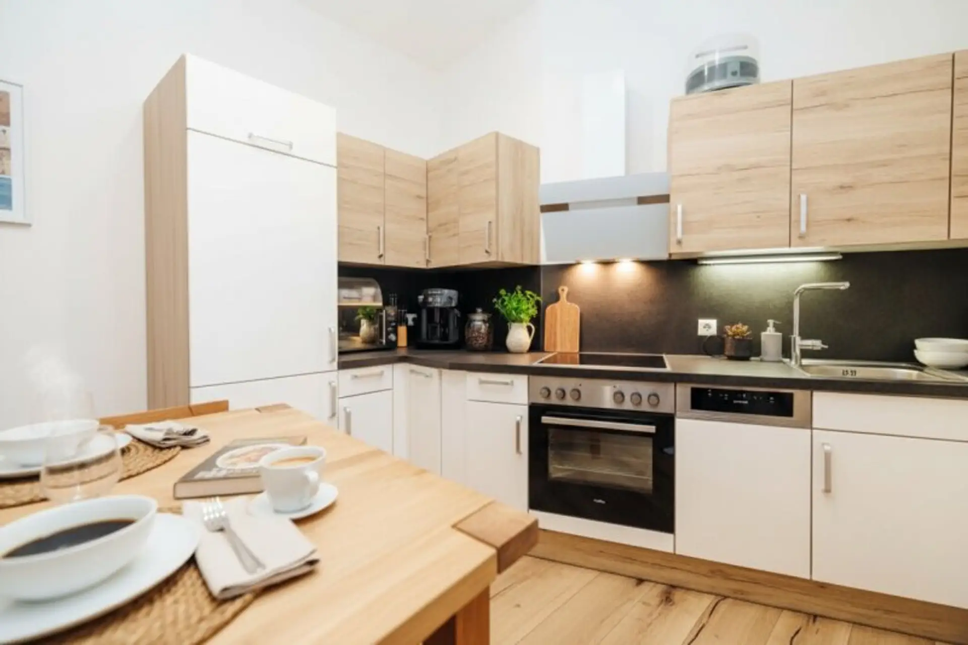 Die moderne, offene Küche ist ein echtes Highlight: Sie ist mit hochwertigen Geräten ausgestattet – darunter ein Kühlschrank mit Gefrierfach, ein Backrohr, ein Ceranfeld, ein Dunstabzug, ein Geschirrspüler und ein Spülbecken mit Arbeitsbeleuchtung. Es gibt zudem reichlich Stauraum und Platz für einen Essbereich.