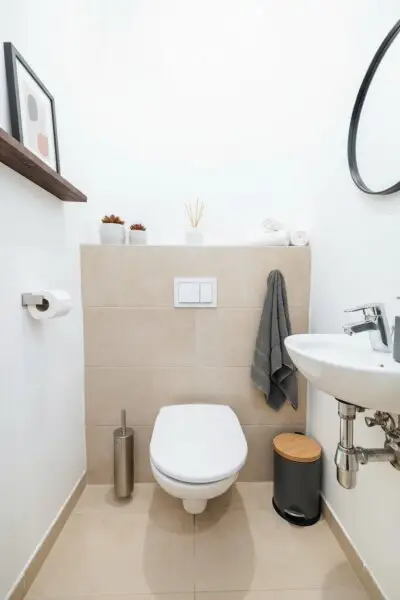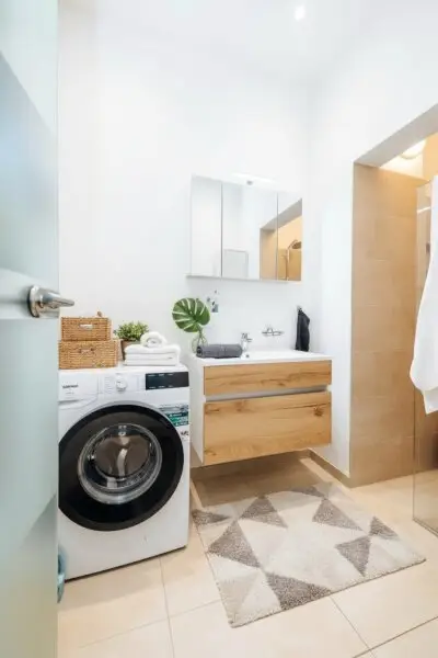 Das Badezimmer ist modern gestaltet und mit einer ebenerdigen Dusche mit Regenfunktion, einem Waschbecken, einem Spiegelschrank und einem Waschmaschinenanschluss ausgestattet. Ein besonderes Highlight ist das Fenster, das für natürliches Licht sorgt, und die dimmbaren Einbauspots, die eine gemütliche Atmosphäre schaffen. Die separate Toilette ist mit einem Handwaschbecken ausgestattet und ebenfalls praktisch vom Vorraum aus zugänglich.