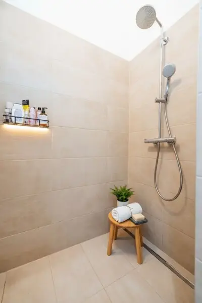 * Modernes Badezimmer: Das Badezimmer verfügt über eine ebenerdige Dusche mit Regenfunktion, ein Waschbecken, einen Spiegelschrank sowie ein Fenster und ist mit dimmbaren Einbauspots ausgestattet – perfekt für eine entspannende Atmosphäre.