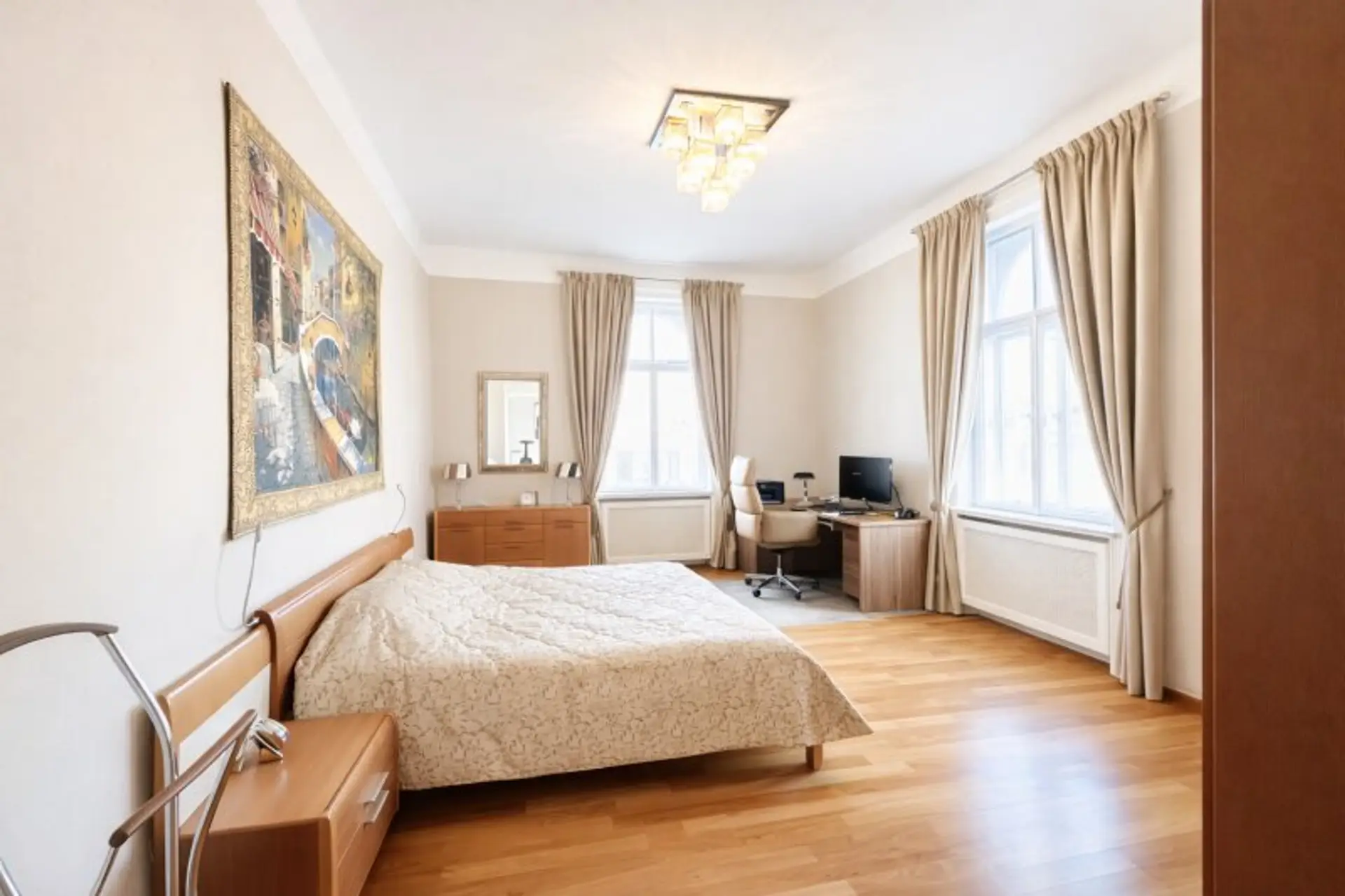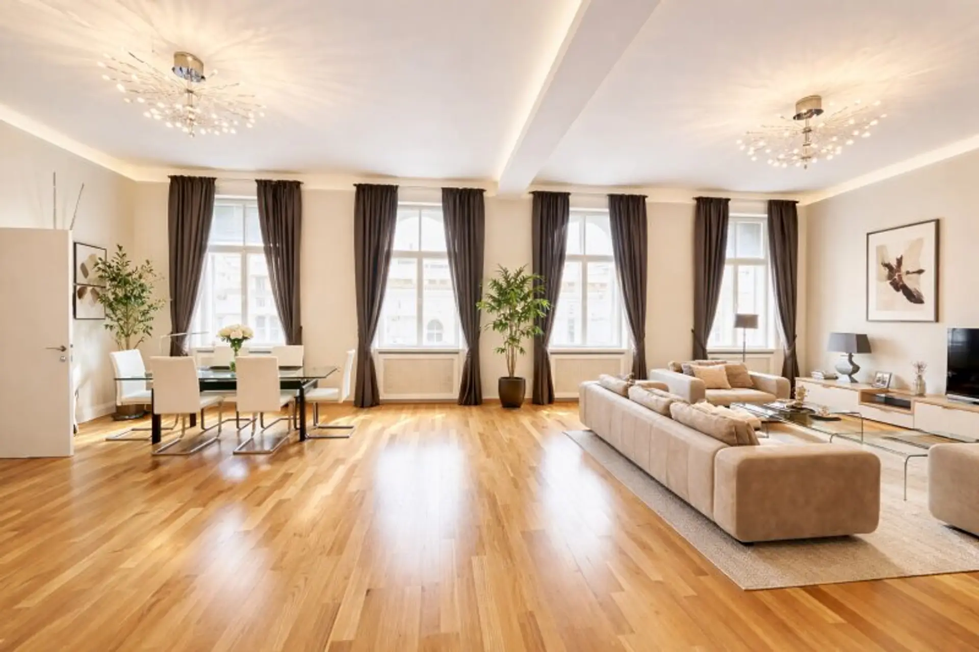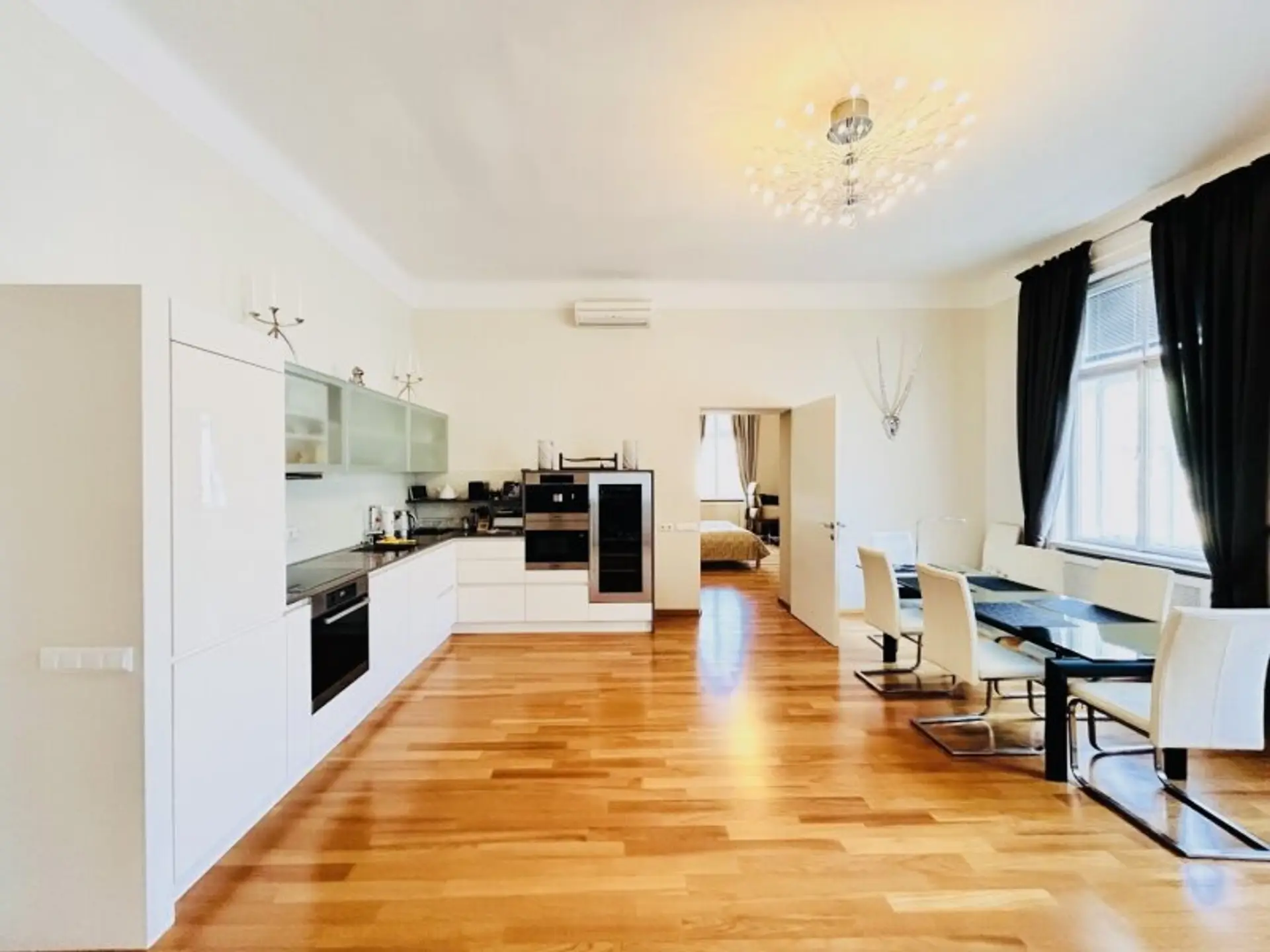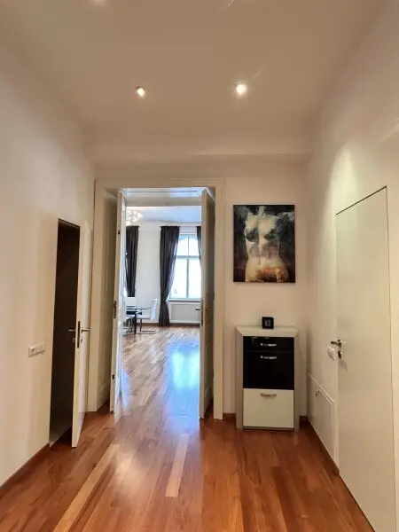 In begehrter Lage des 1. Bezirks befindet sich diese stilvolle, rund 120 m² große Wohnung im 4. Stock der Eßlinggasse. Die Stadtwohnung überzeugt mit einer geschmackvollen Einrichtung, einer modernen Küche mit hochwertigen Markengeräten sowie großzügigen Stauraumlösungen durch maßgefertigte Schränke.