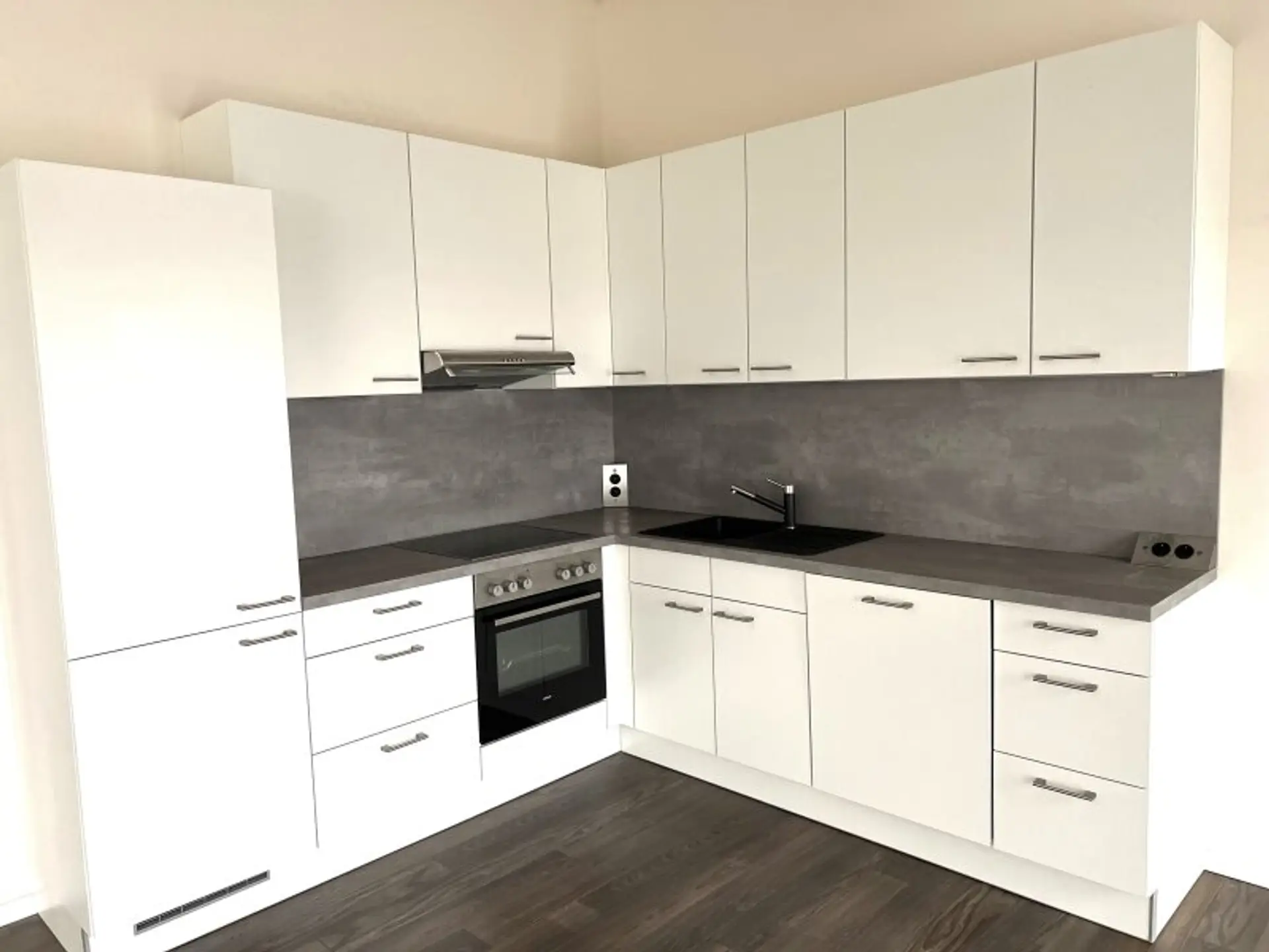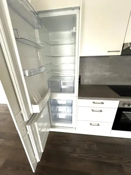 Die moderne, innovative Küche im zeitlosen Design ist mit einem großen Kühlschrank, E-Herd, Dunstabzug, Spüle und Geschirrspüler ausgestattet.