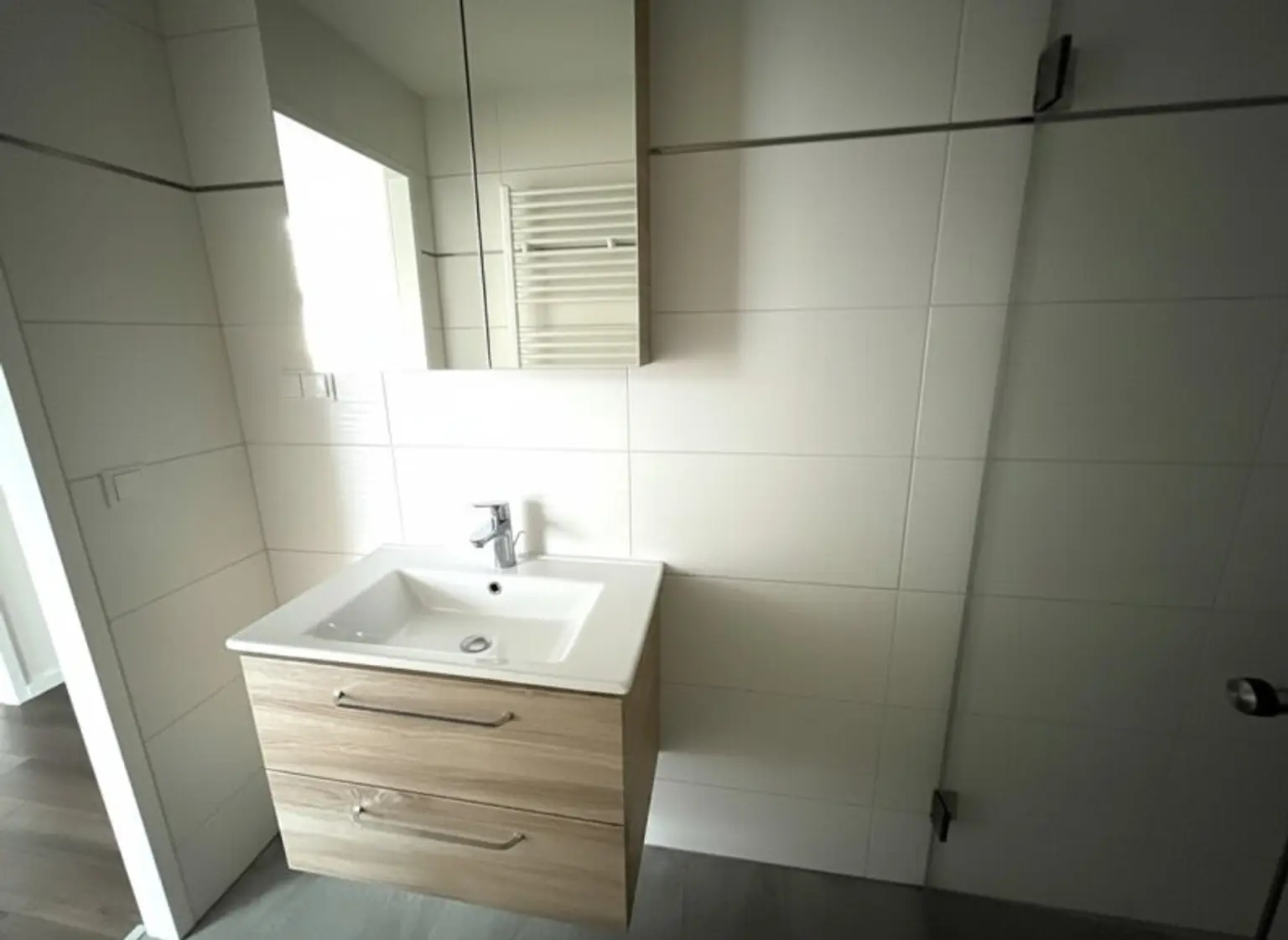 -) Badezimmer mit Dusche, Waschbecken mit stilvollem Unterschrank und Spiegel mit Beleuchtung
