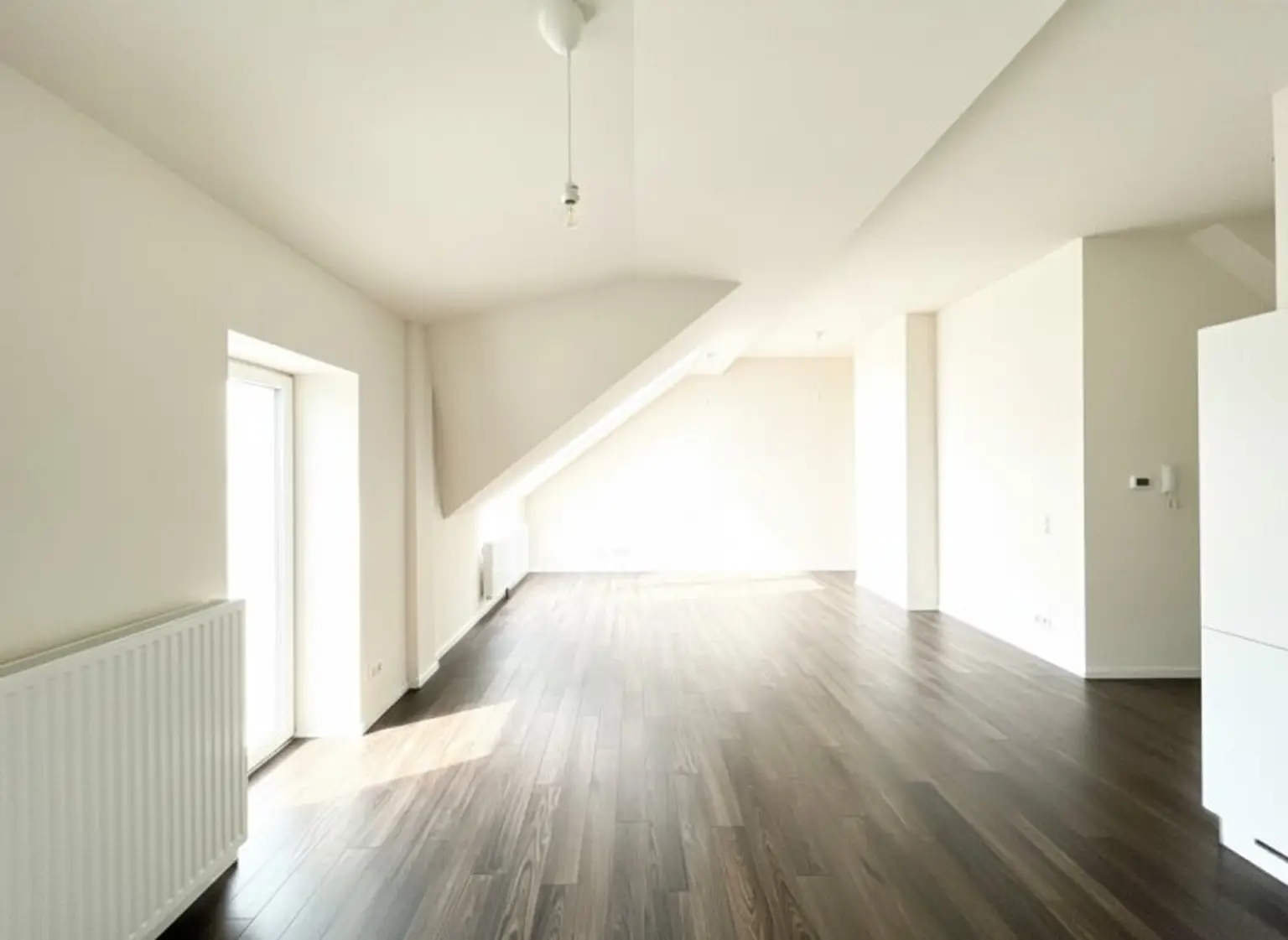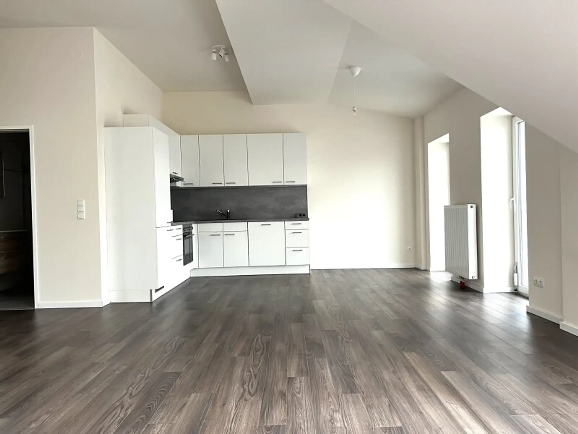 Sie ist ca. 70 m² groß und hell. Das auch deshalb, weil es auf der Wohnzimmerseite kein unmittelbares Gegenüber gibt.