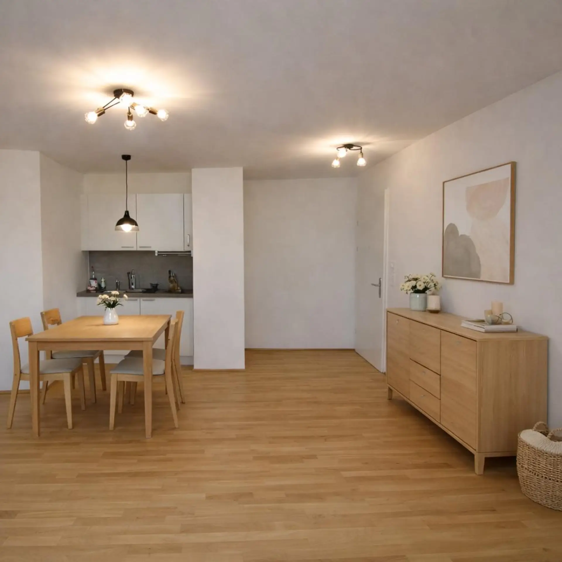 *Die Wohnung wird mit hochwertiger Küche und Badezimmerspiegelschrank vermietet. Alle weiteren Möbel auf den Beispielbildern sind KI-generiert und dienen ausschließlich der visuellen Veranschaulichung.