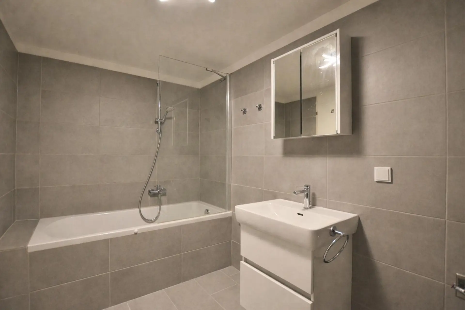 * Badezimmer mit Badewanne und Duschwand