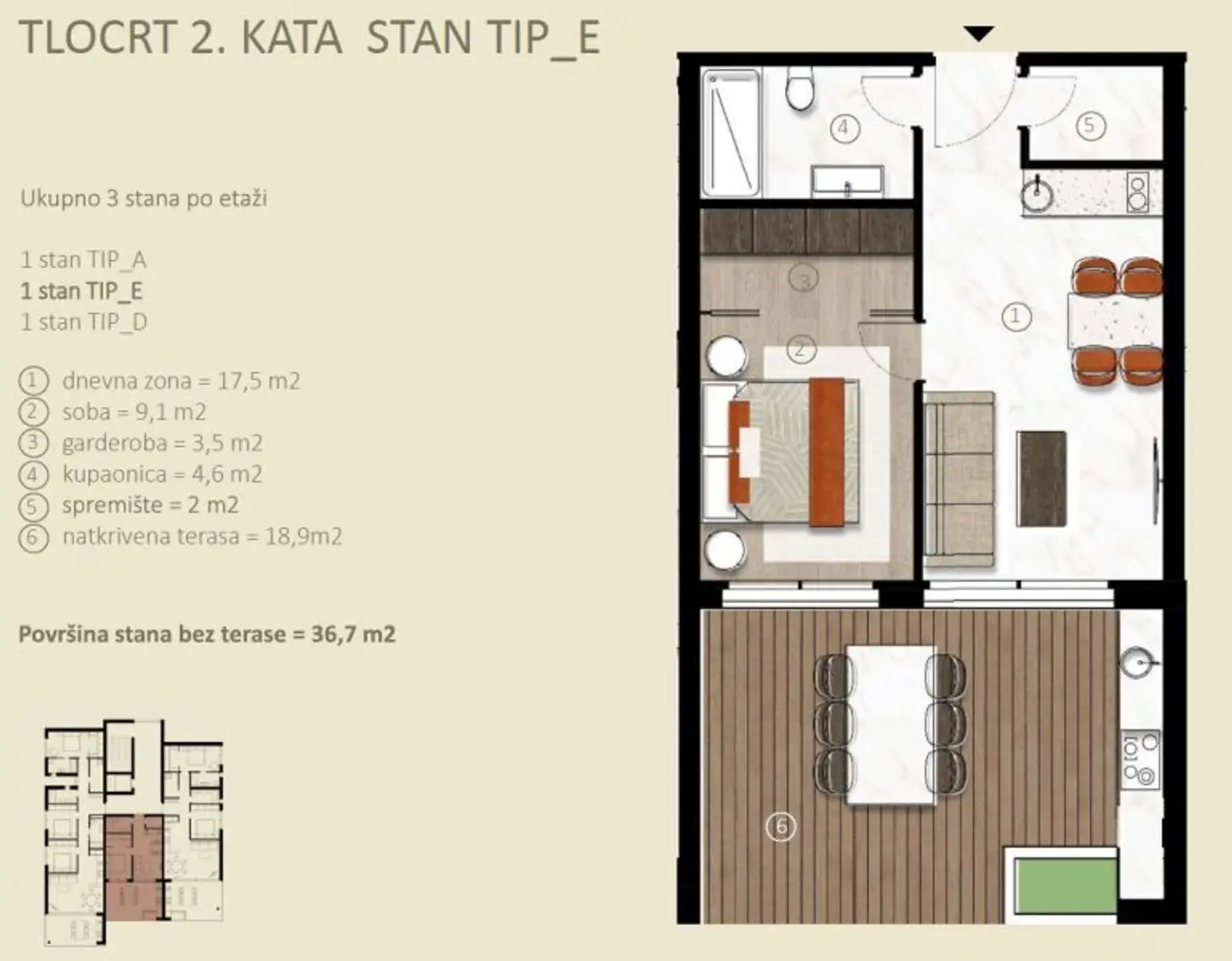 Aufgeteilt ist die in eine Küche/Wohnzimmer/Esszimmer, 1 Schlafzimmern, 1 Bädern, Abstellraum, Garderobe und einer rd. 19 m² großen Terrasse.