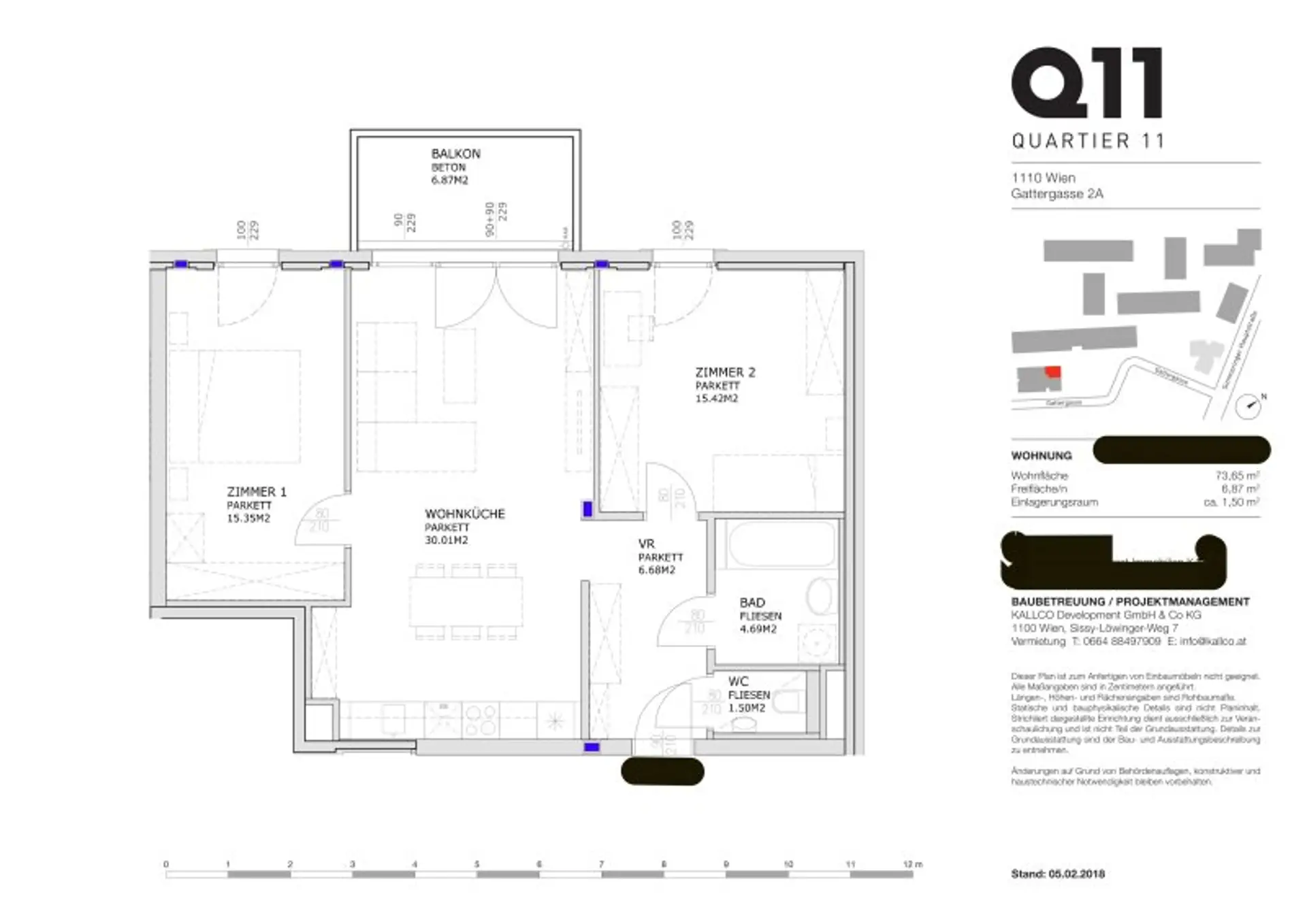 Diese ca. 73,65 m² große, attraktive Wohnung mit einem ca. 6,87 m² großen Balkon befindet sich in einem im Jahr 2018 erbauten Gebäude im 1. Liftstock. Der Zugang zum Lift ist barrierefrei.