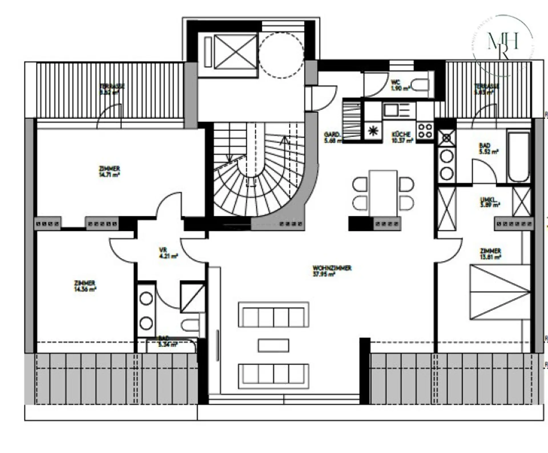 Der Rohdachboden befindet sich im straßenseitigen Teil der Liegenschaft. Laut einer unverbindlichen Studie finden auf 117m² vier Zimmer sowie eine große Dachterrasse platz.