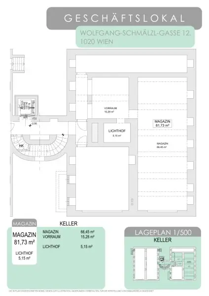 Das darunterliegende Magazin mit ca. 81,73 m² ist ebenfalls an denselben Mieter vermietet (befristet bis 14.07.2028).