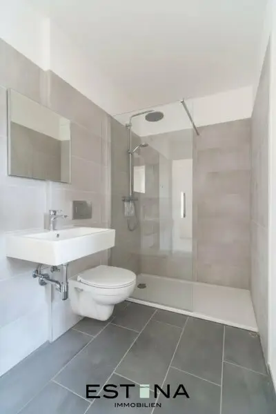 - Badezimmer mit Dusche, Waschbecken, Toilette und Waschmaschinenanschluss