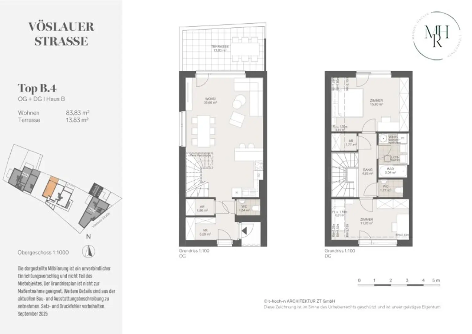 Die Wohnung B4 im mittleren Teil des Projekts verfügt über einen wunderschönen Blick über die Grossauer Felder und Wiesen sowie in die Weinberge. im ersten Stock der zweigeschossigen Dachgeschosswohnung findet man einen großzügigen Wohn- und Essbereich vor sowie eine Toilette und einen Abstellraum vor. Zudem hat man vom Wohnbereich direkten Zugang auf die Terrasse. Die Maisonettewohnung verfügt im 1. Stock über zwei Schlafzimmer sowie ein Badezimmer und ein weiteres WC.