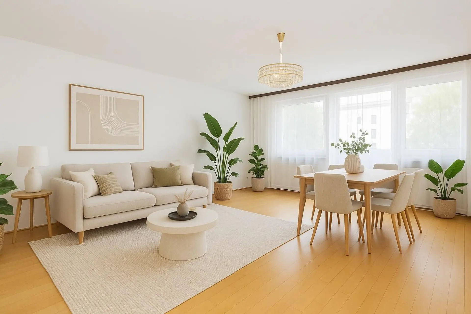 Das Herzstück der Wohnung ist das großzügige, helle Wohnzimmer mit beeindruckender Glasfront, die für viel Tageslicht sorgt und den direkten Zugang zur Loggia ermöglicht. Hier lässt sich ein offener Wohn- und Essbereich gestalten, der zum gemütlichen Verweilen einlädt.