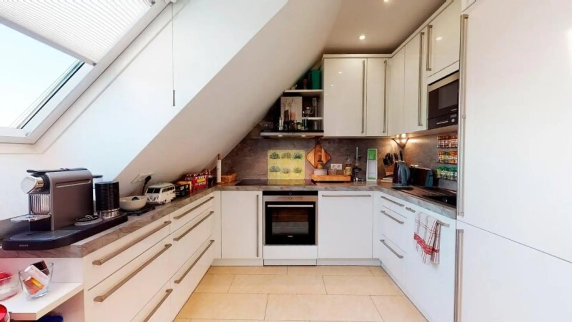 Besonders hervorzuheben sind die Küchengeräte – allesamt hochwertige Produkte der Marke „Siemens“ mit Backofen, übergroßem Induktionskochfeld, Mikrowelle, Kühl-Gefrierkombination und Geschirrspüler; es gibt reichlich Stauraum für Geschirr/Besteck, Lebensmittel und Vorräte.