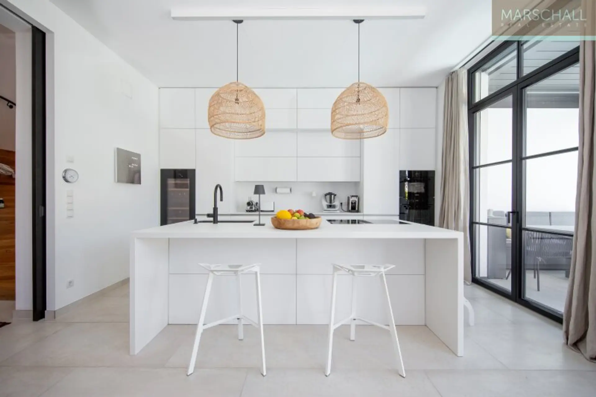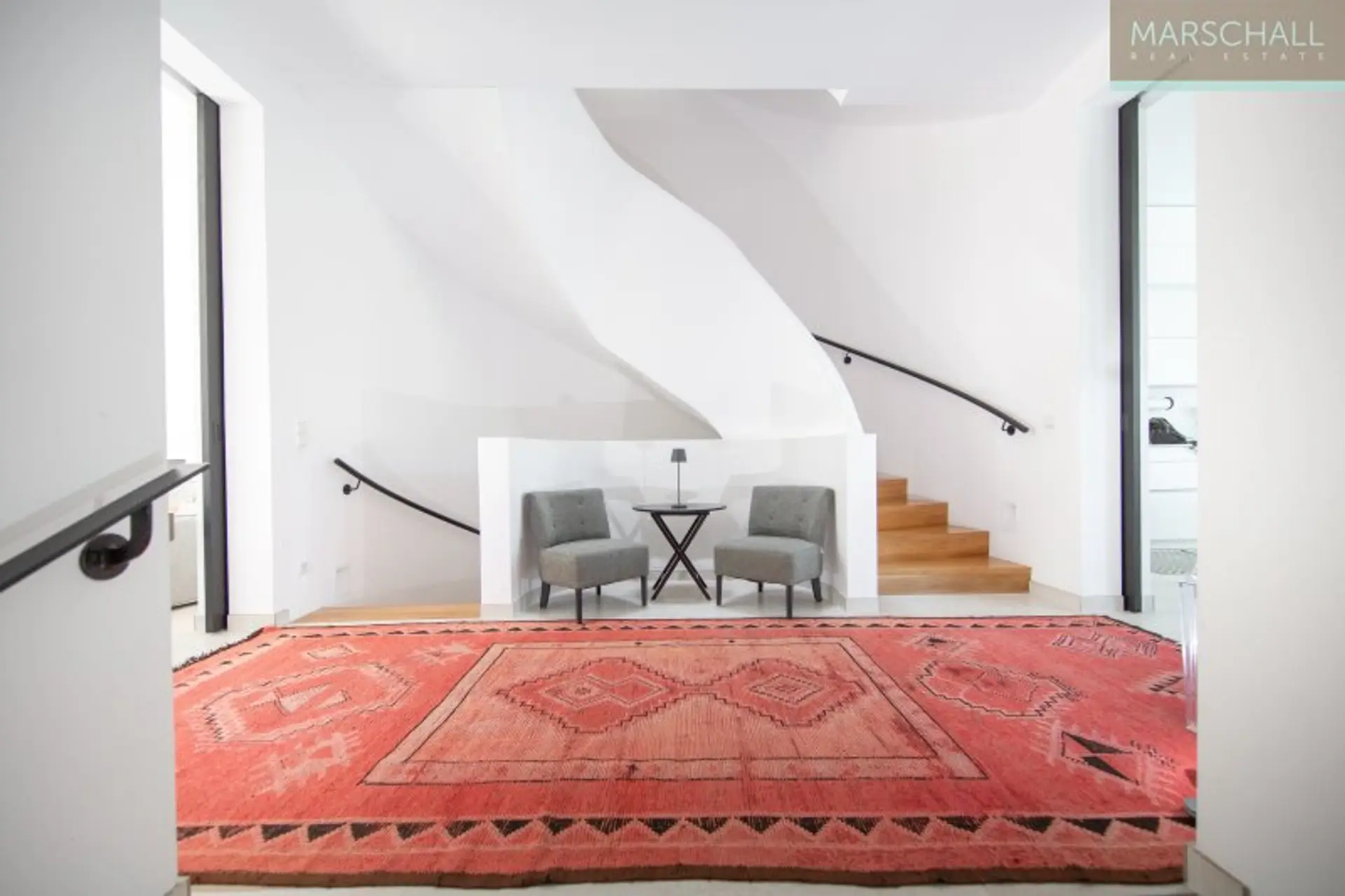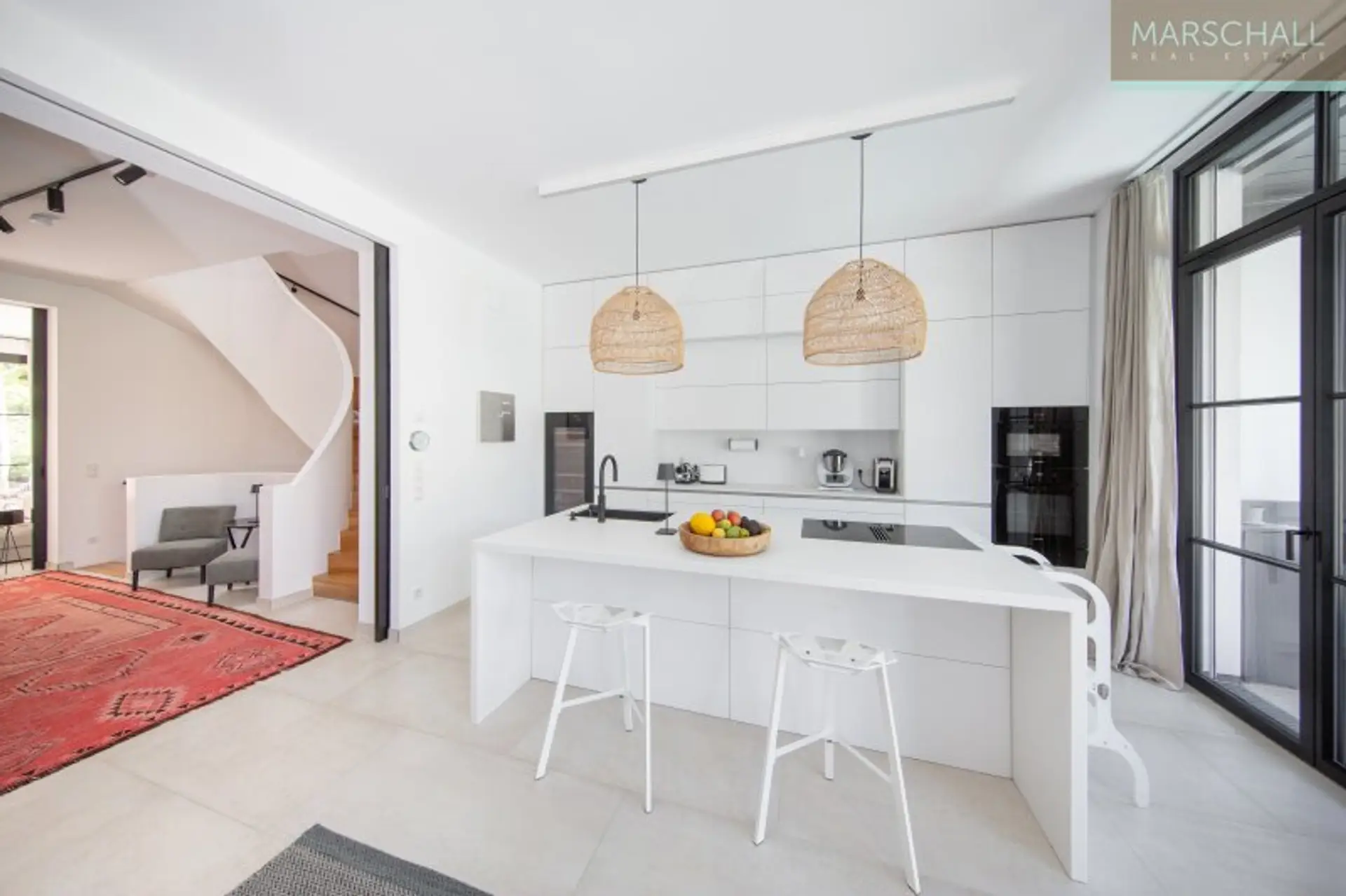 Vom Haupteingang im EG gelangt man, an der Garderobe und dem Gäste-WC vorbei, in die Eingangshalle mit dem zentralen Treppenaufgang. Richtung Osten öffnet sie sich in den Wohnsalon mit offenem Kamin und Ausgang in den Patio, eine Art durch Mauern geschützte Terrasse, der durch die hohe Verglasung wie die Fortführung des Wohnsalons in den Außenbereich wirkt. Richtung Westen betritt man von der Eingangshalle aus die großzügige, luxuriös ausgestattete Wohnküche mit dem Essbereich. Auch von dort gibt die hohe Verglasung den Blick auf die direkt vorgelagerte, abgeschattete Terrasse und den Poolbereich frei. Diese Ebene besticht besonders durch die für Neubauten ungewöhnliche Raumhöhe von 3 m.