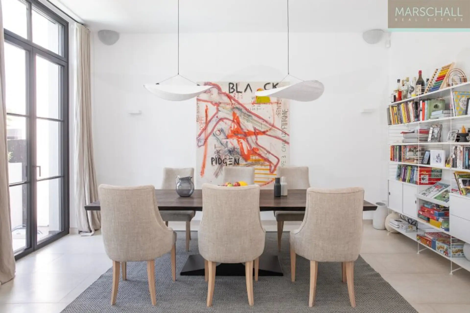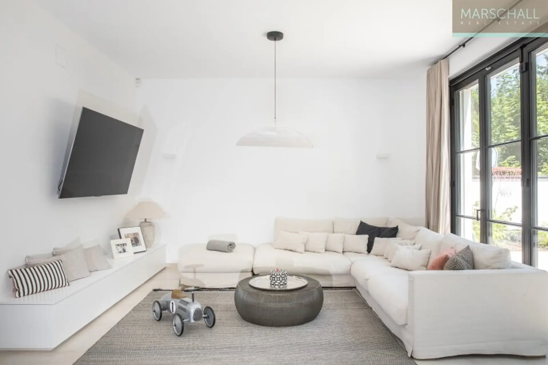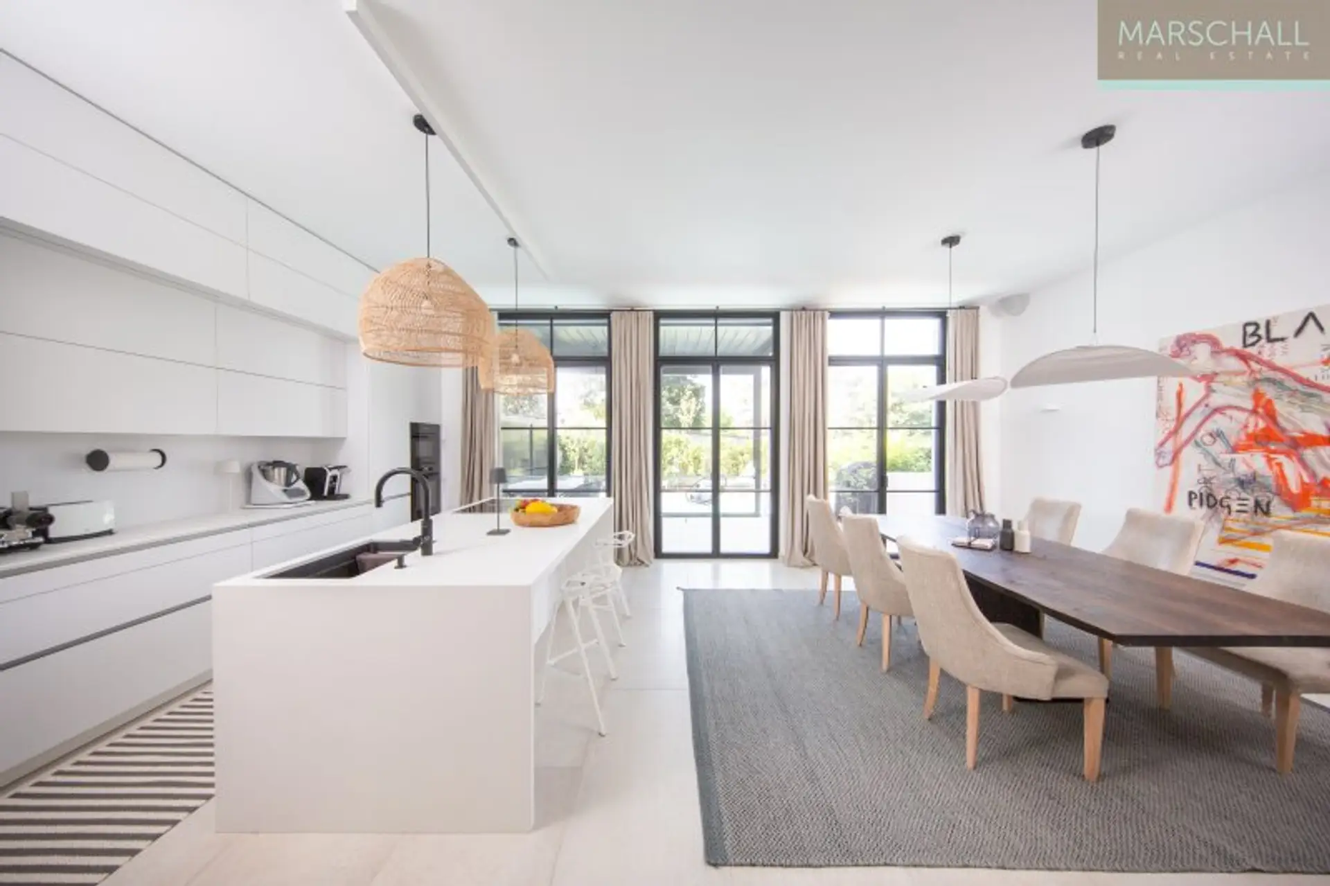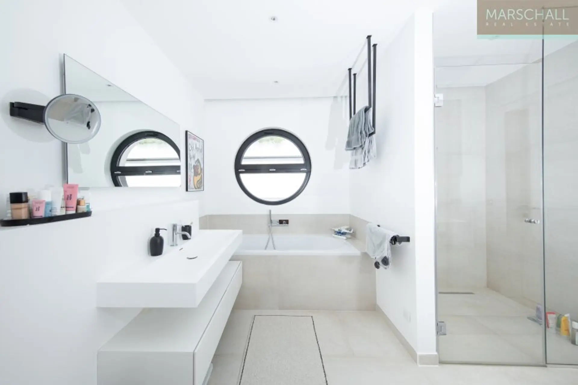 Vom Haupteingang im EG gelangt man, an der Garderobe und dem Gäste-WC vorbei, in die Eingangshalle mit dem zentralen Treppenaufgang. Richtung Osten öffnet sie sich in den Wohnsalon mit offenem Kamin und Ausgang in den Patio, eine Art durch Mauern geschützte Terrasse, der durch die hohe Verglasung wie die Fortführung des Wohnsalons in den Außenbereich wirkt. Richtung Westen betritt man von der Eingangshalle aus die großzügige, luxuriös ausgestattete Wohnküche mit dem Essbereich. Auch von dort gibt die hohe Verglasung den Blick auf die direkt vorgelagerte, abgeschattete Terrasse und den Poolbereich frei. Diese Ebene besticht besonders durch die für Neubauten ungewöhnliche Raumhöhe von 3 m.