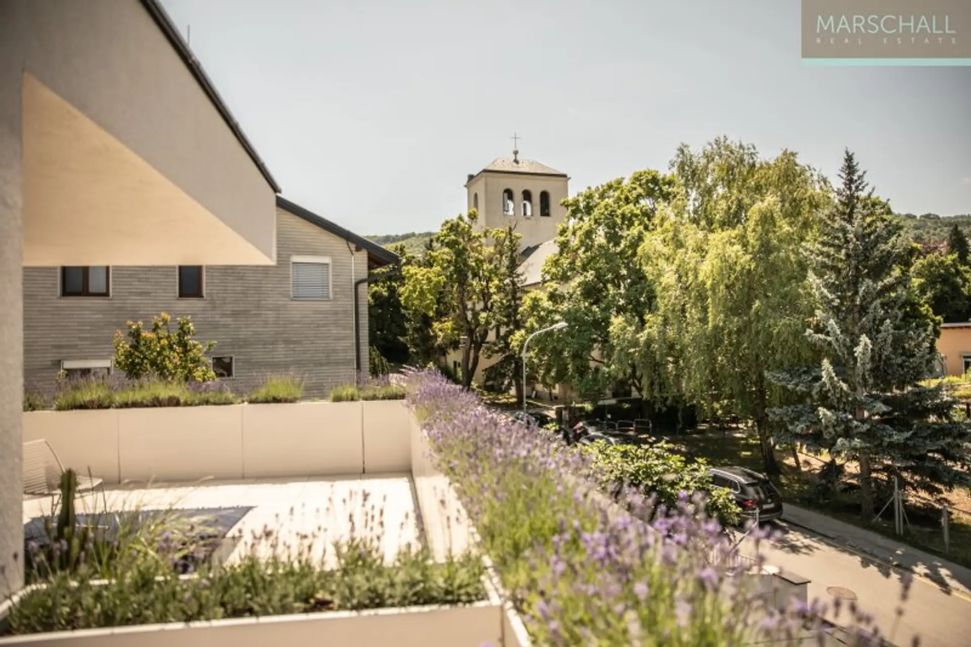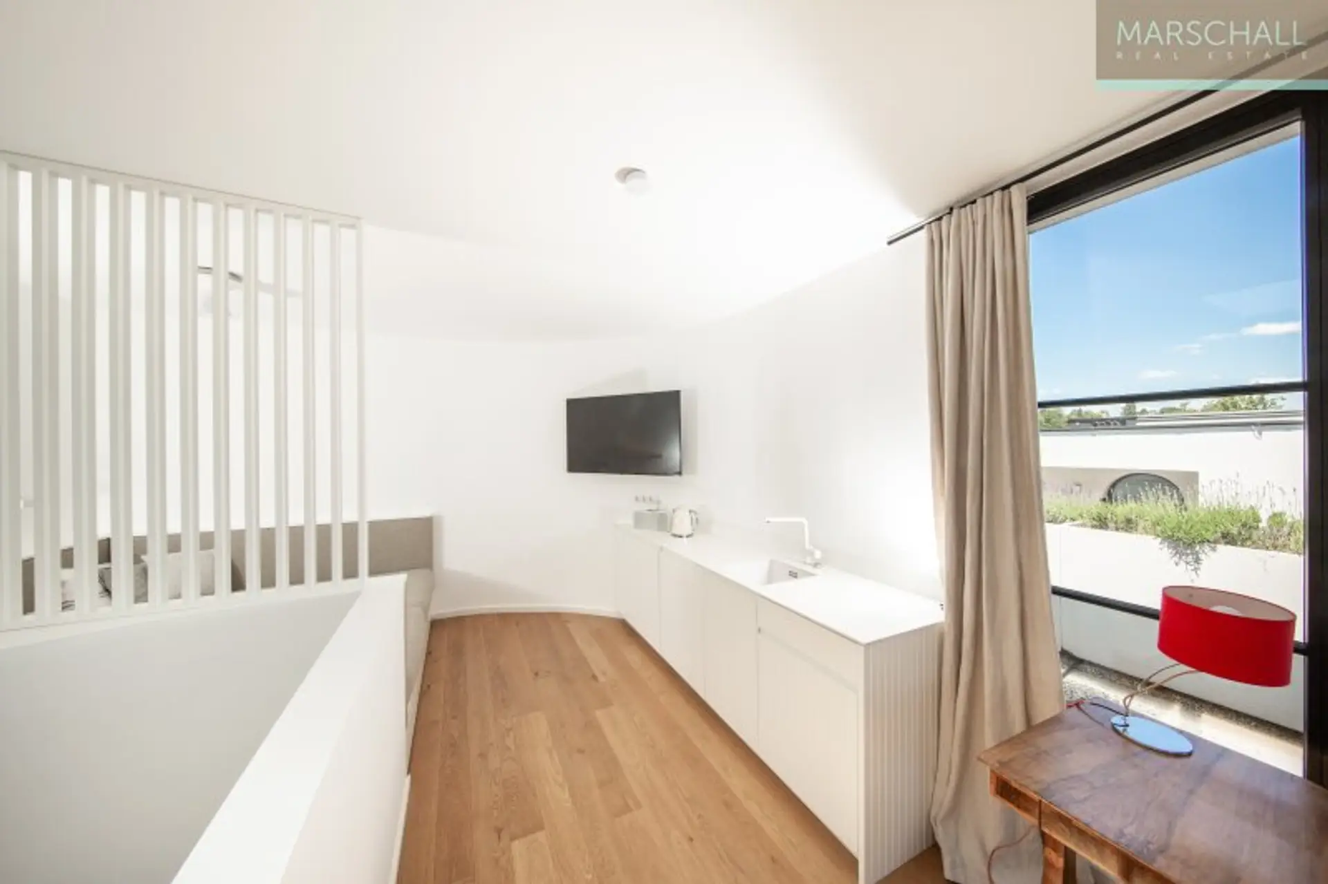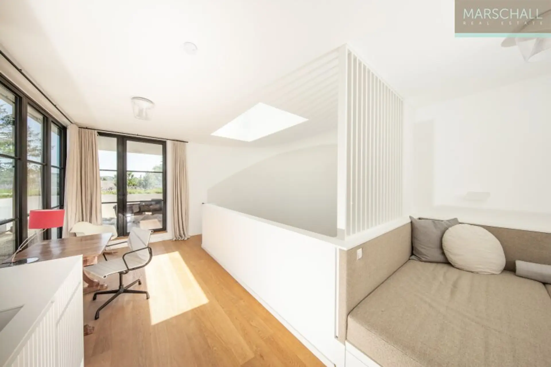 Im DG gelangt man durch ein Galerie-Zimmer mit Teeküche, Daybed und Homeoffice auf die ca. 42 m2 große Dachterrasse mit herrlichem Blick auf die umliegende Landschaft.