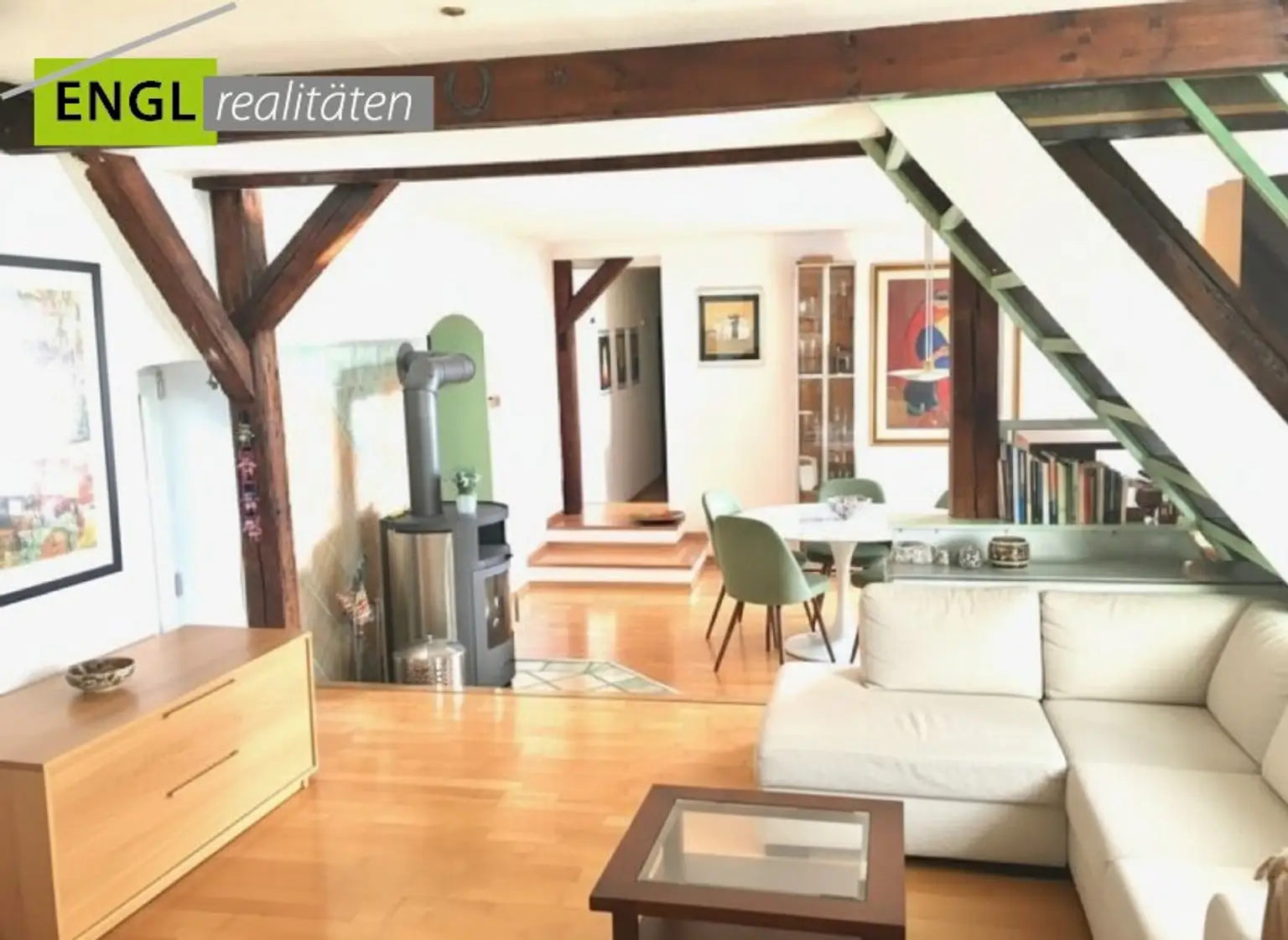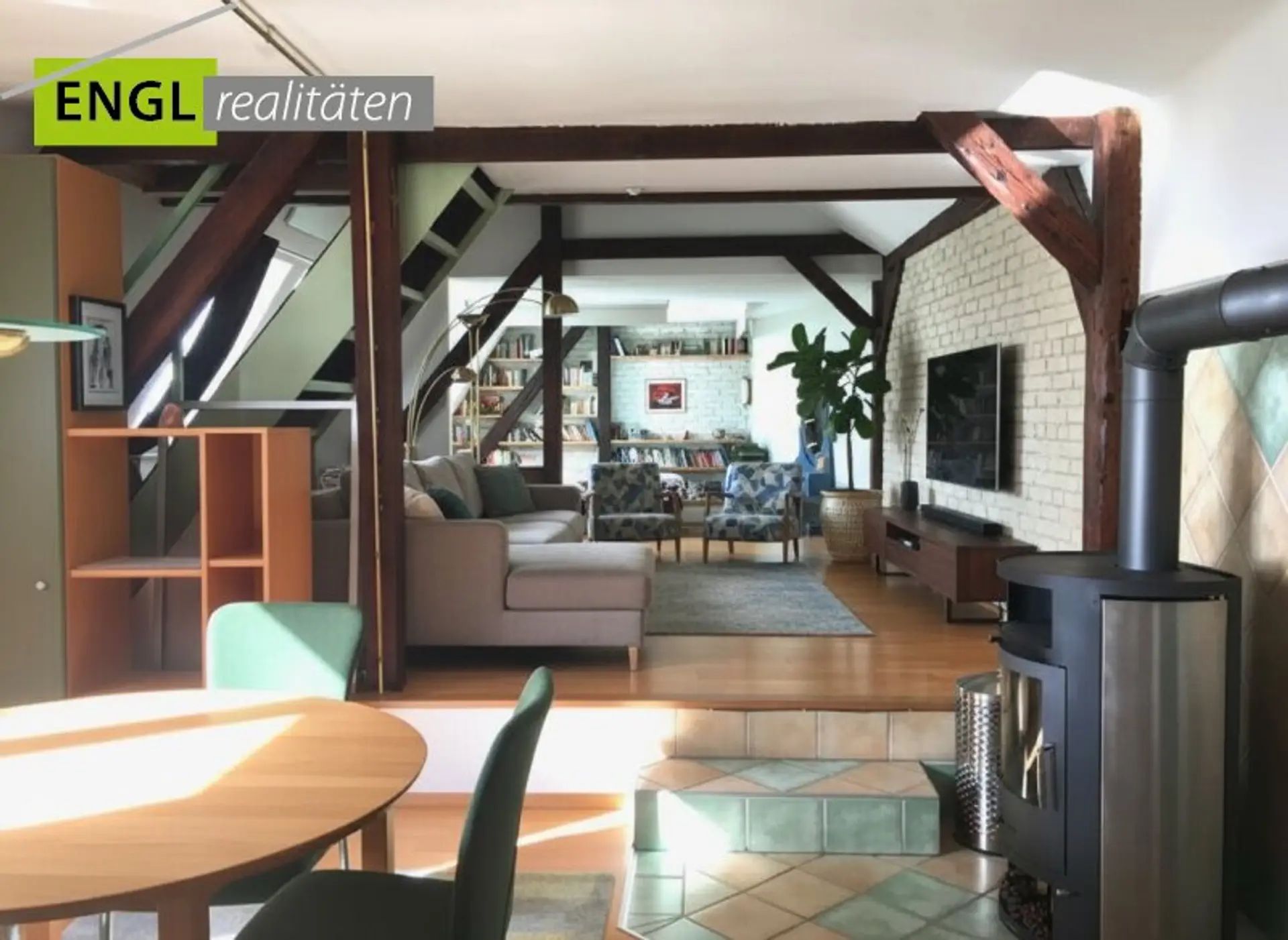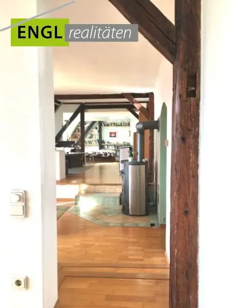 Das besondere an dieser Wohnung ist, dass sie durch den Dachbodenausbau eine Art Loft mit verschiedene Ebenen geschaffen wurde. Durch die offene Gestaltung der Räume von formellen Esszimmer, Wohnebene bis Schlafzimmer ist alles schön tageshell. Die Dachbalken an den Dachschrägen setzten chaletartige Akzente. Beheizt kann die Wohnung mit Nachtspeicher und Infrarotpanelle werden. Ein Heizkamin mit Sichtfenster (Holz) sorgt für zusätzliche Wärme und eine wohlige Atmosphäre.
