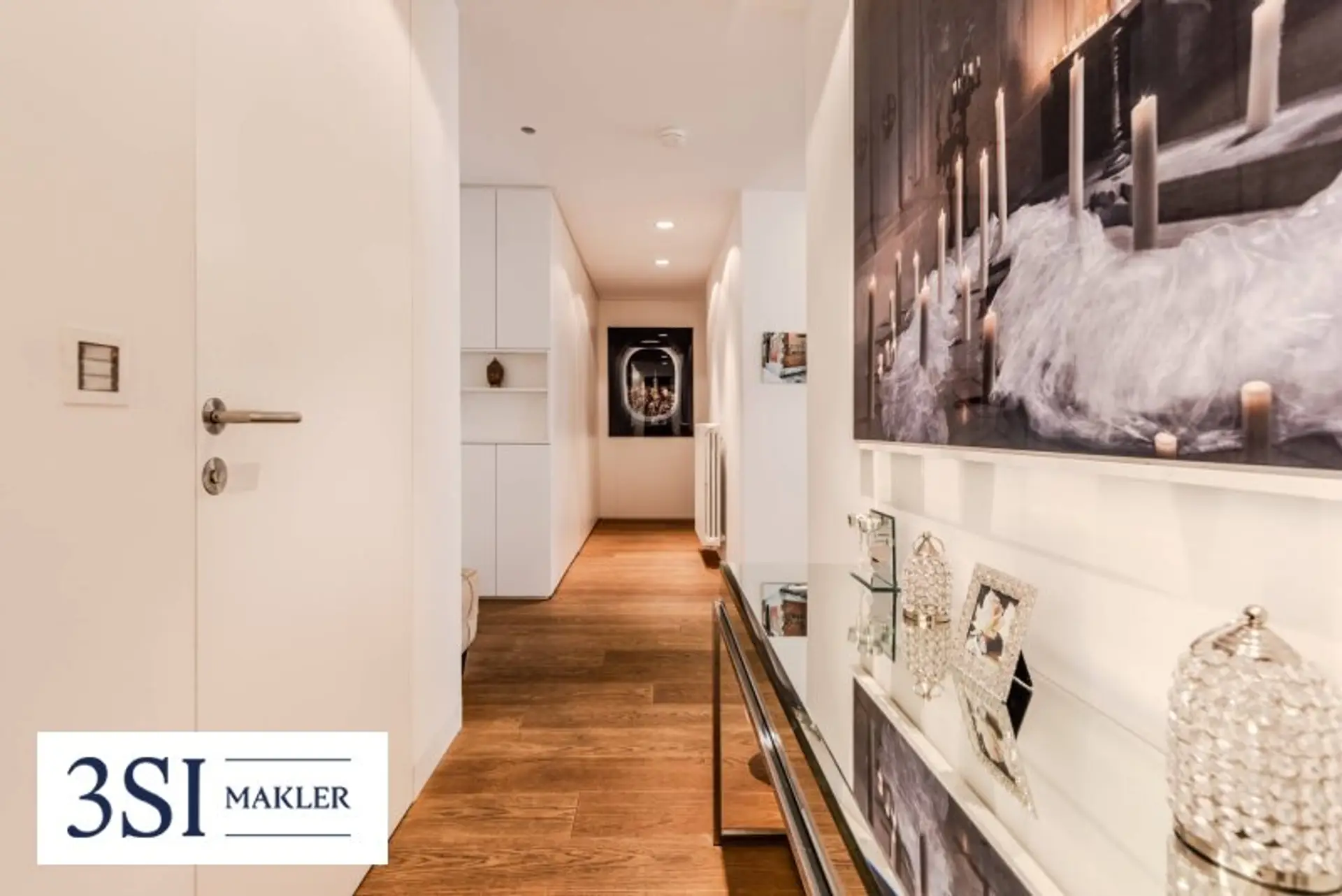 Großzügige Fensterfronten sorgen für ein lichtdurchflutetes Ambiente, während edle Parkettböden und ein durchgängiges, elegantes Gestaltungskonzept den hohen Qualitätsanspruch dieser Immobilie unterstreichen. Die Wohnung überzeugt gleichermaßen durch Funktionalität wie durch ästhetische Raffinesse.