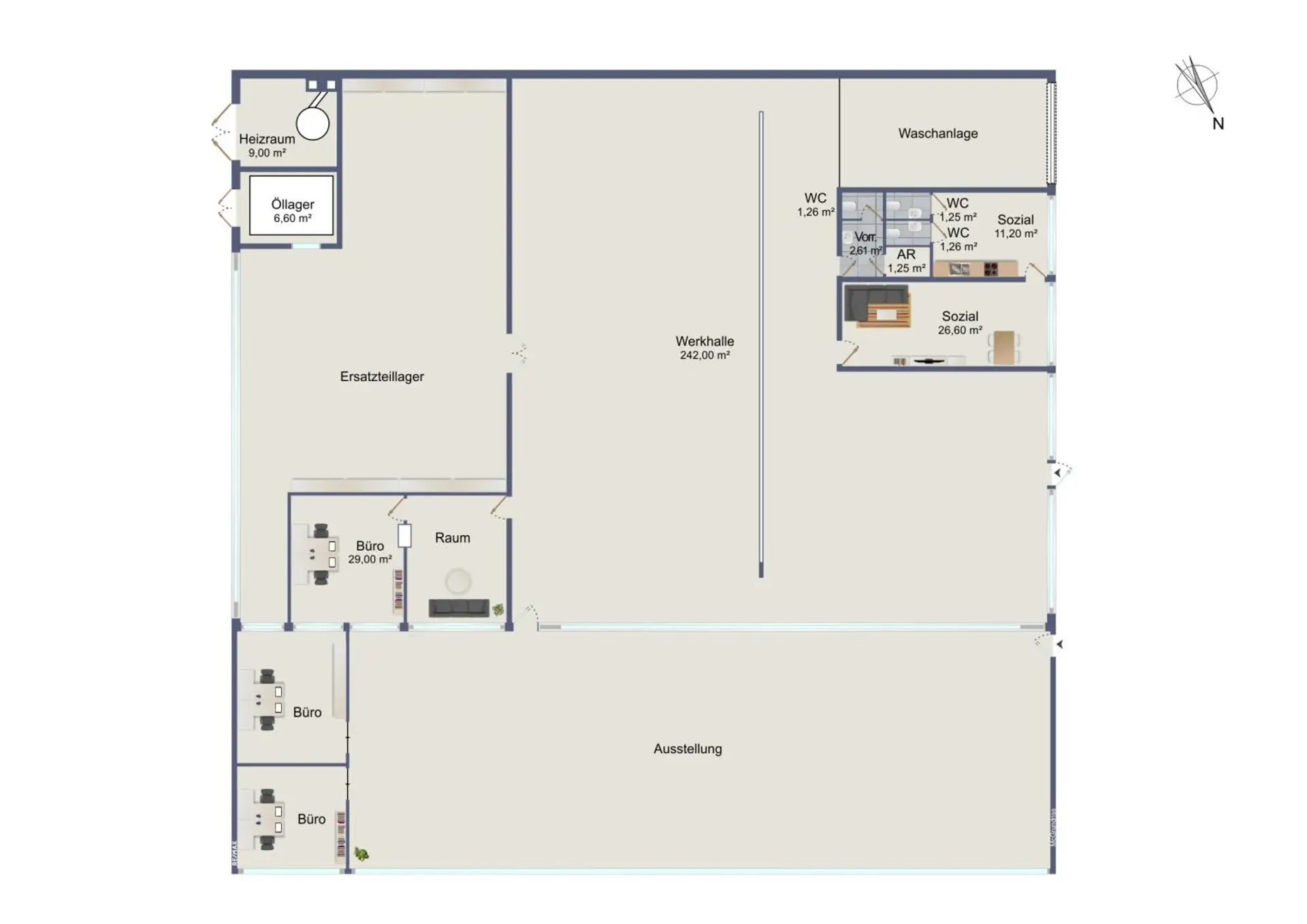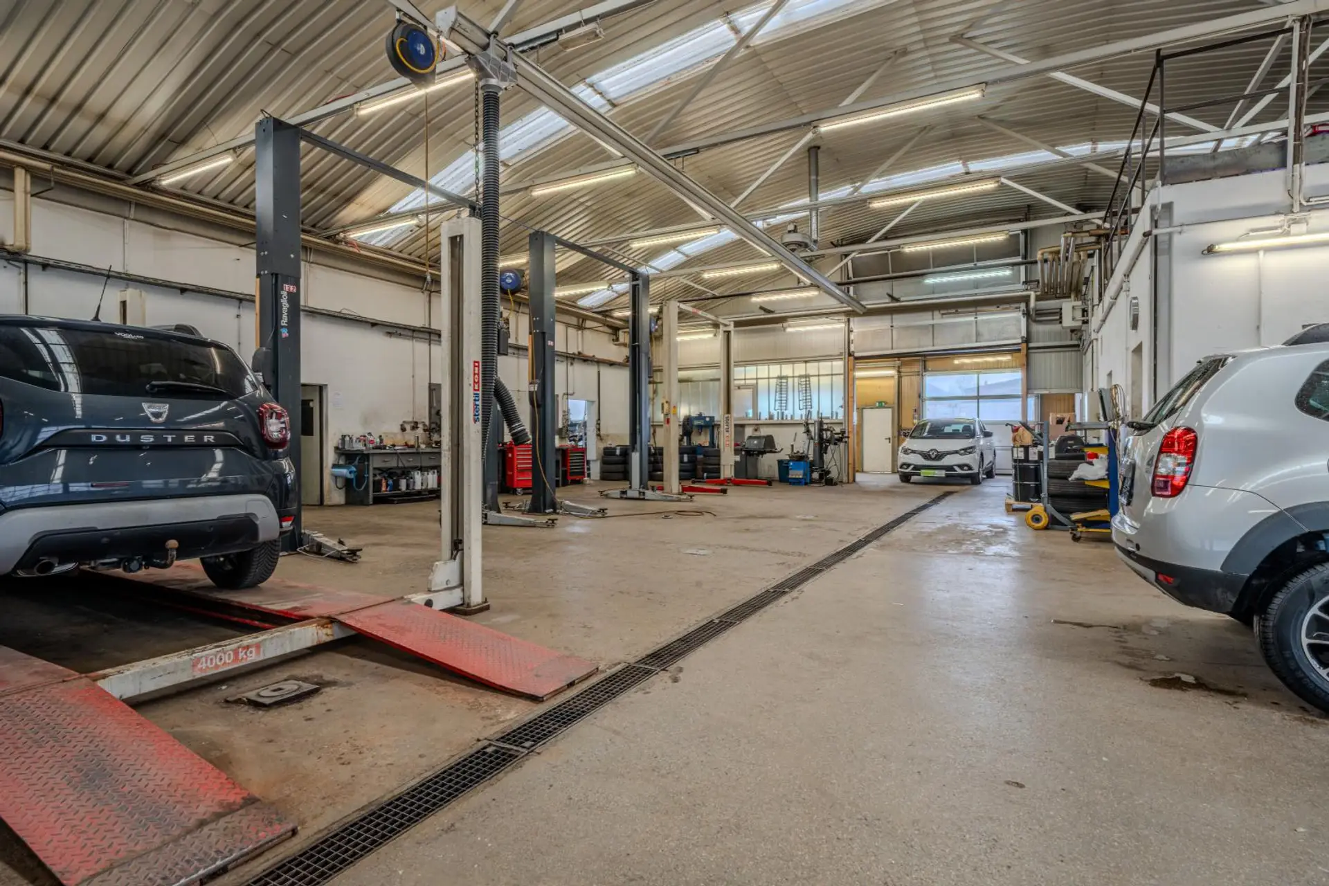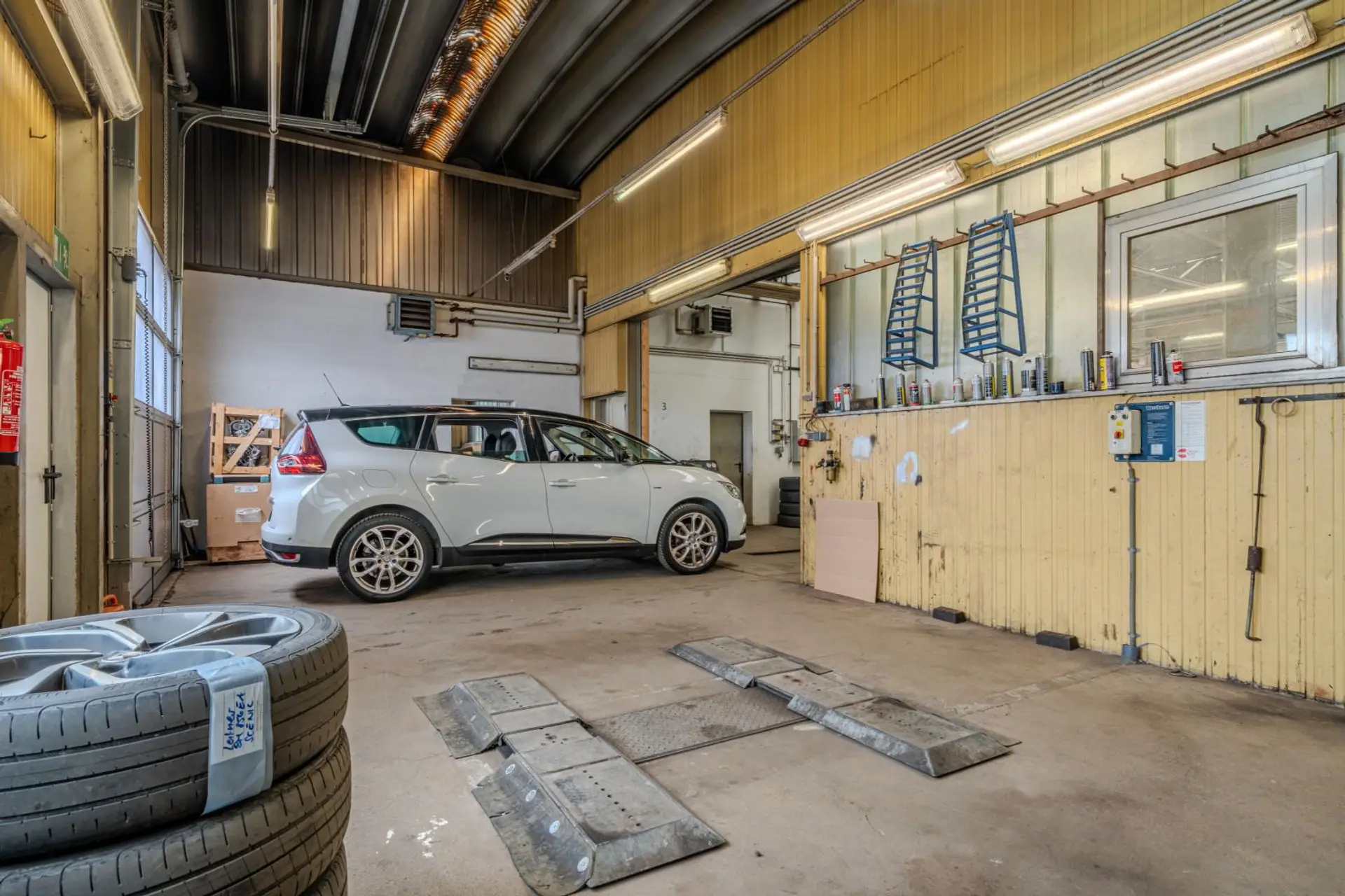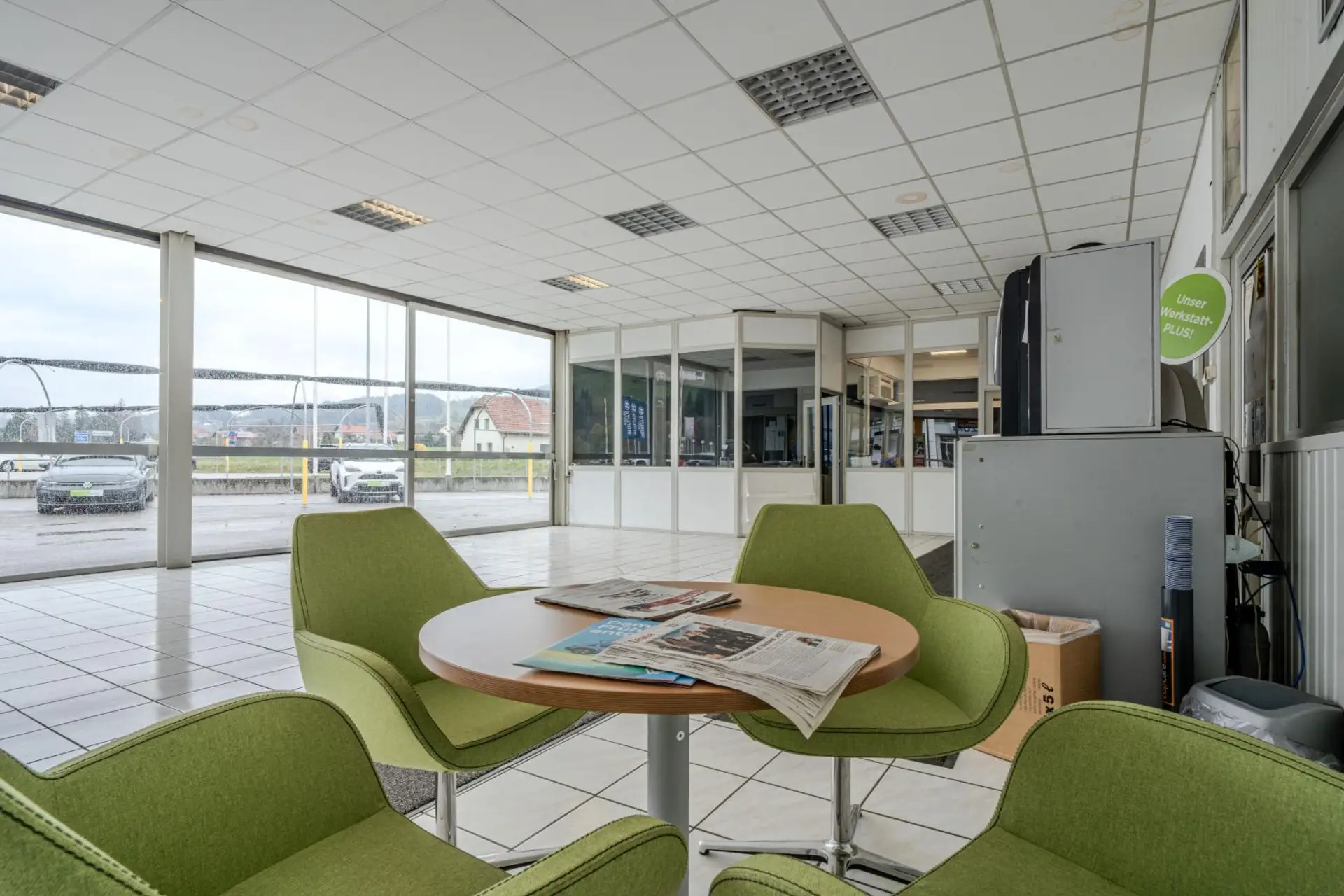 Das Objekt bietet neben einem großen Ausstellungsraum, einigen Büros sowie einem Ersatzteillager eine 242m² große Werkhalle mit 2 Einfahrtstoren und 5 Hebebühnen, eine Waschbox sowie Sozialräume und WC-Anlagen.