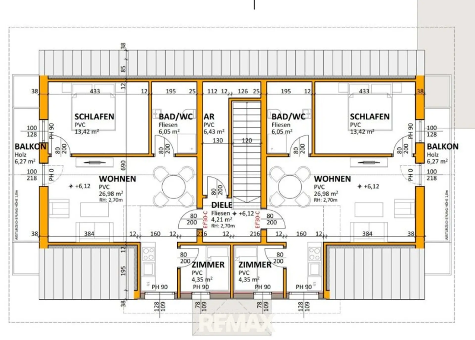 Dachgeschoß: 2 Apartments mit Bad/WC, Wohnbereich, 2 Schlafzimmer, 2 Balkone